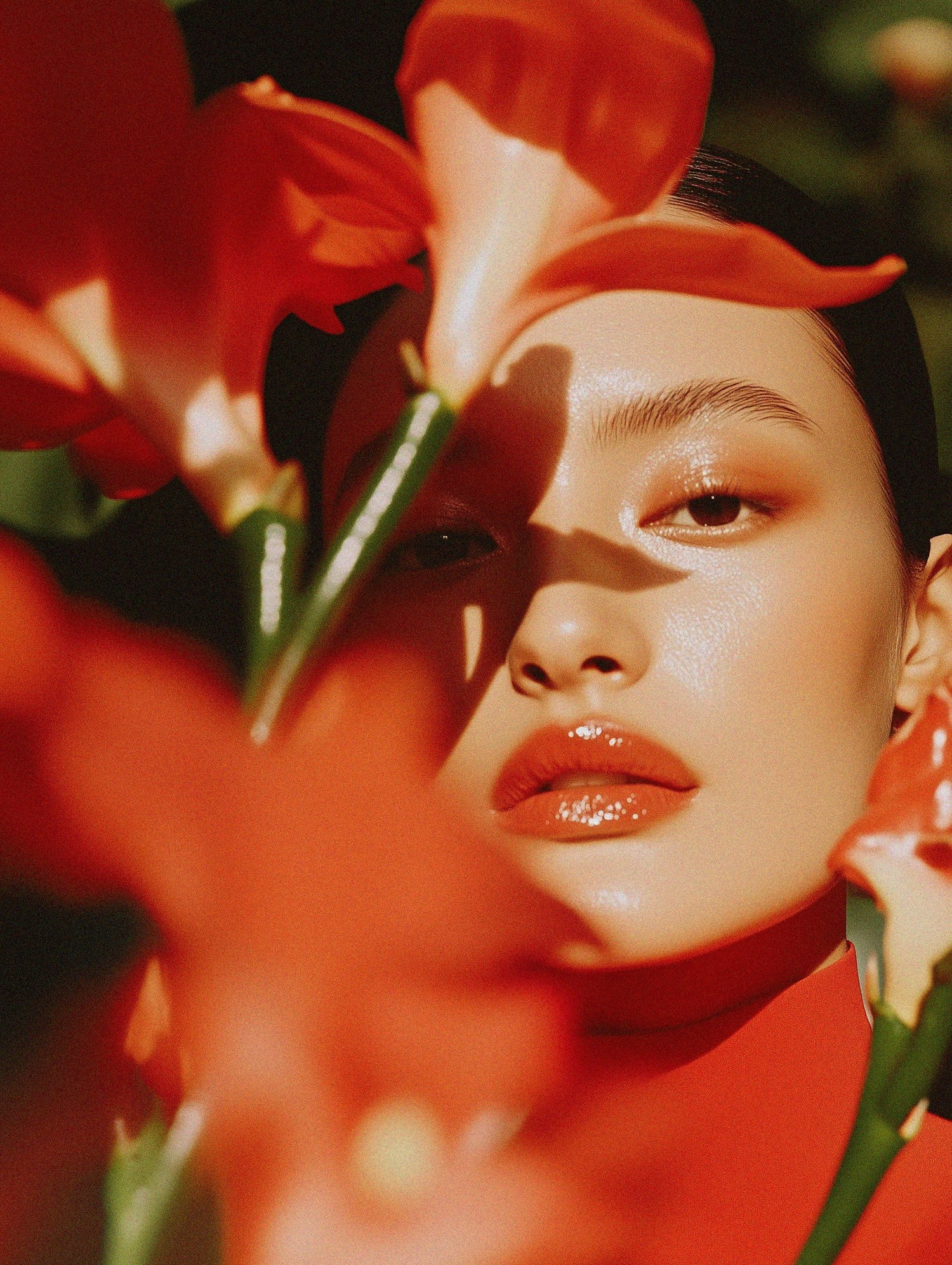 Close-up of an Asian woman with glossy lips surrounded by vibrant red flowers, creating a dramatic and artistic effect.