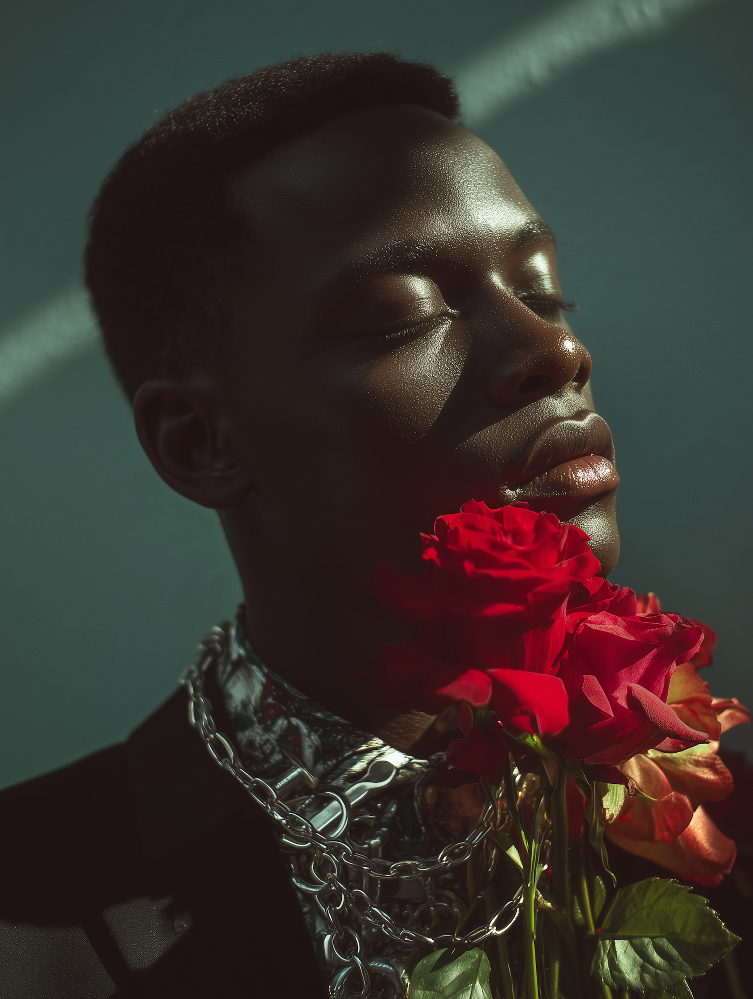 Close-up of a serene man holding red roses, wearing a black suit and silver chains, with a teal background and dramatic lighting.