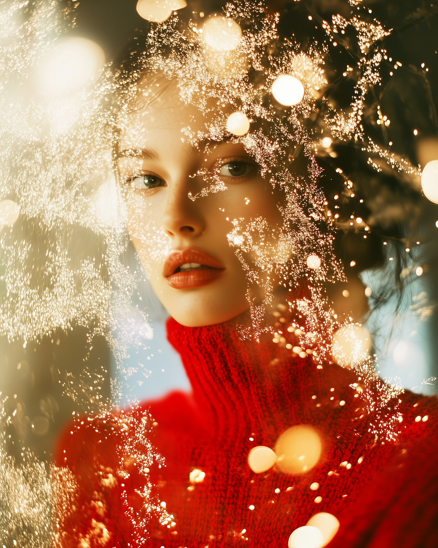 A serene woman in a red sweater surrounded by sparkling golden lights, creating a dreamy and ethereal atmosphere.