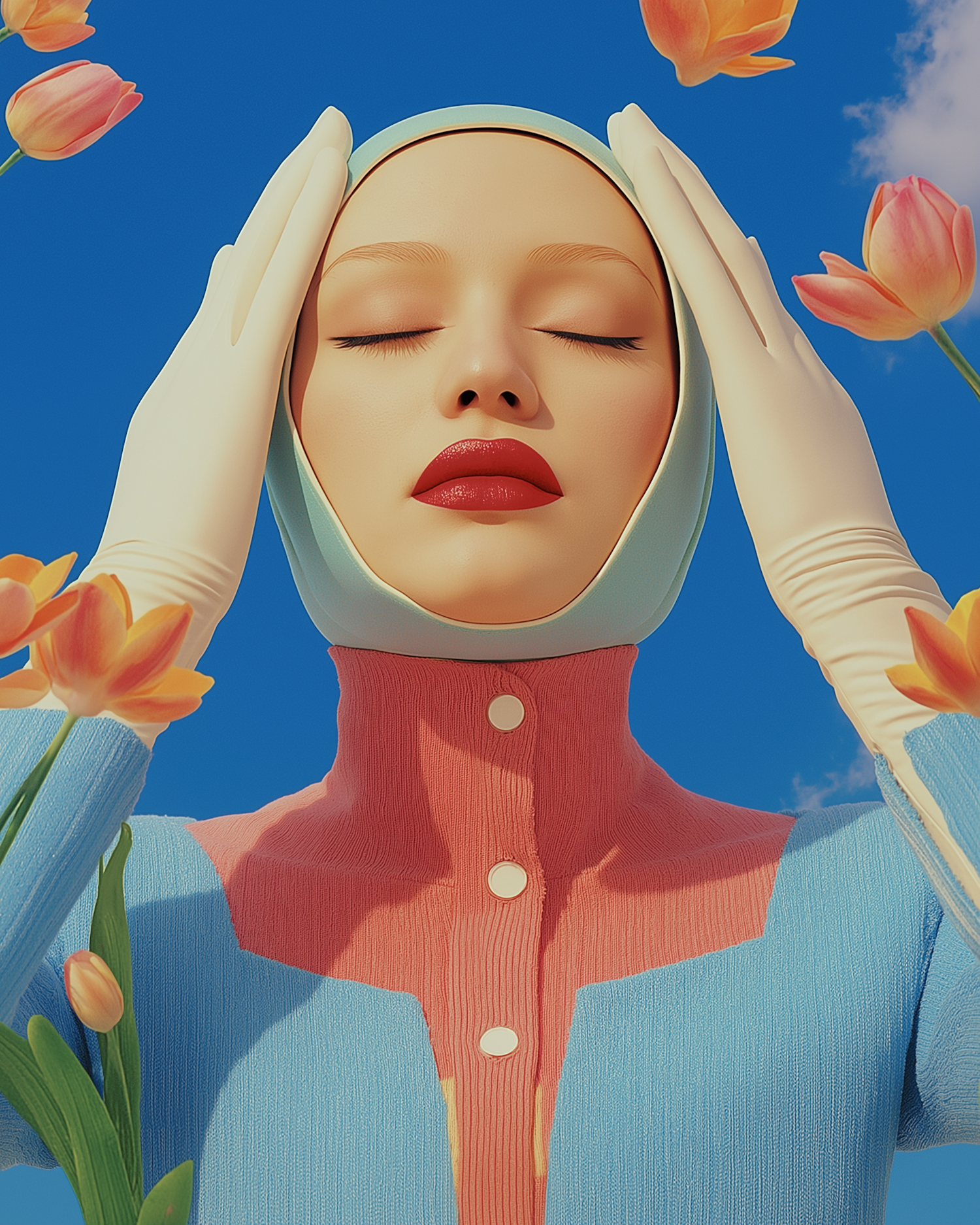 A serene woman in pastel attire with closed eyes, surrounded by orange tulips against a vivid blue sky.