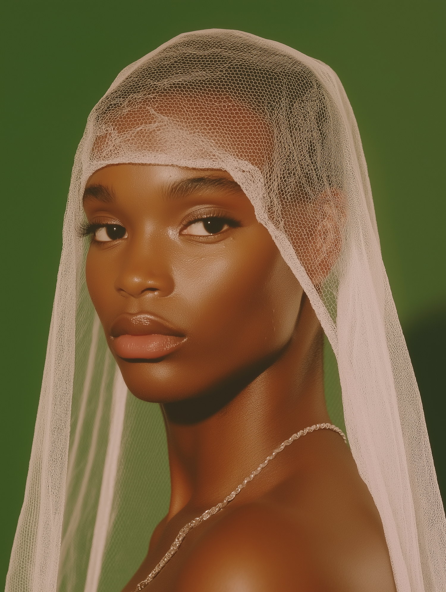 Elegant portrait of a woman with a sheer veil against a green background, highlighting her expressive eyes and smooth skin.