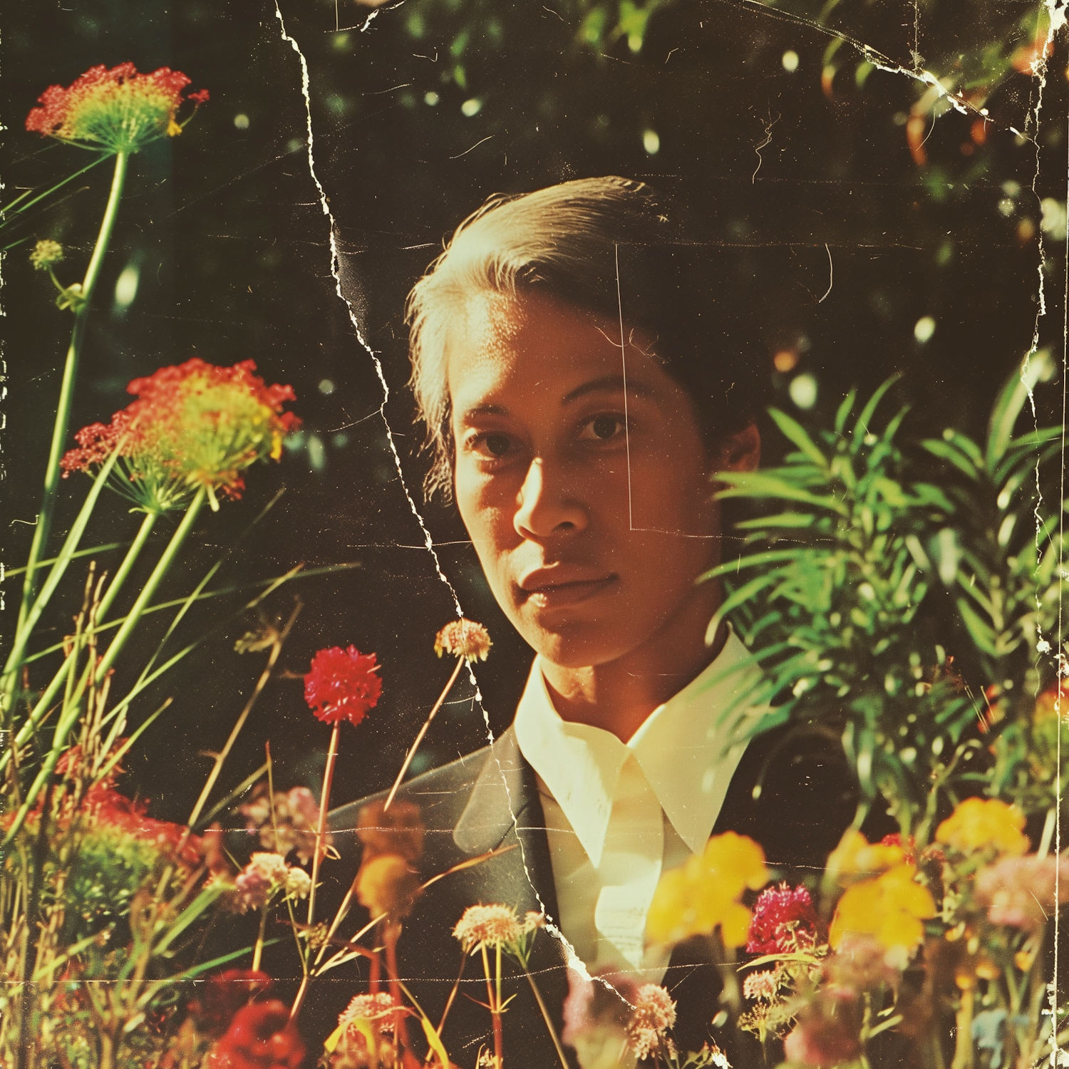 A young man in a suit stands among colorful flowers, with a vintage, nostalgic feel due to visible creases and scratches.