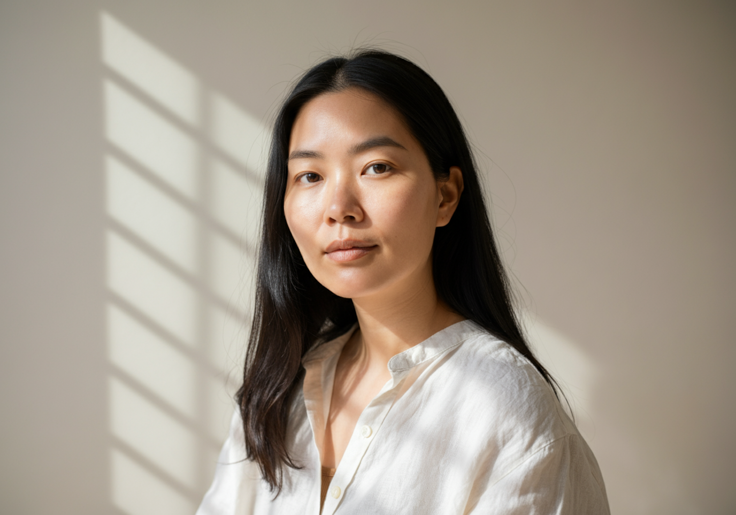 Portrait of a young Asian woman in a white shirt, softly lit with natural light and a minimal beige background.