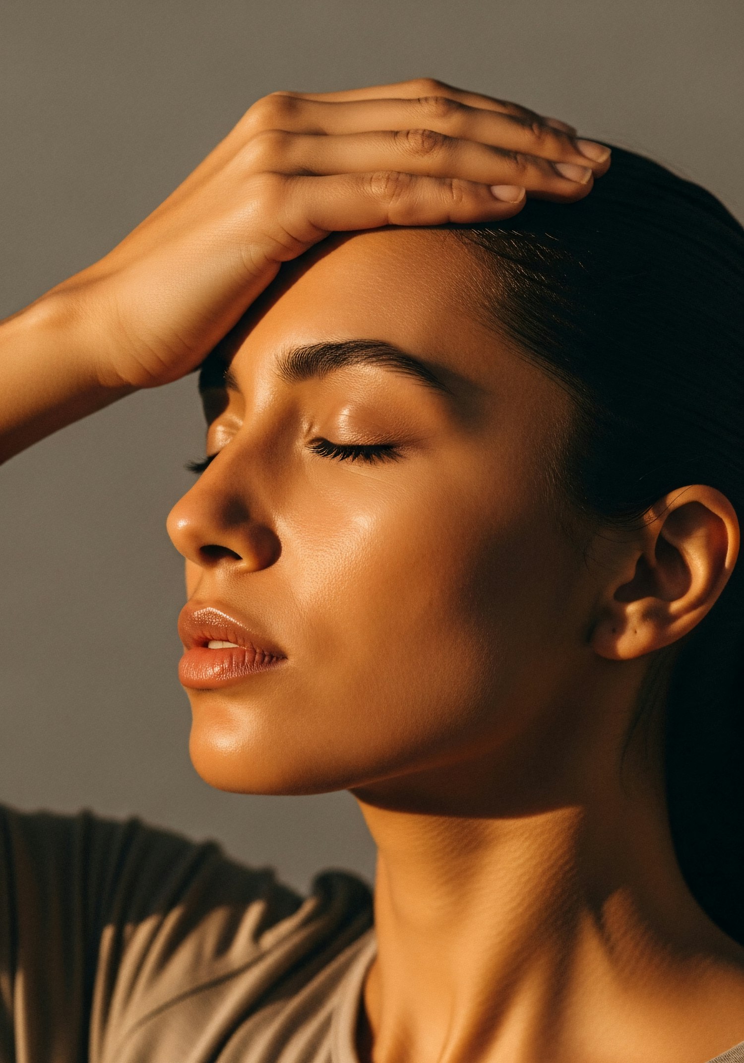 Close-up of a serene individual with warm lighting highlighting their features, creating a calm and introspective mood.