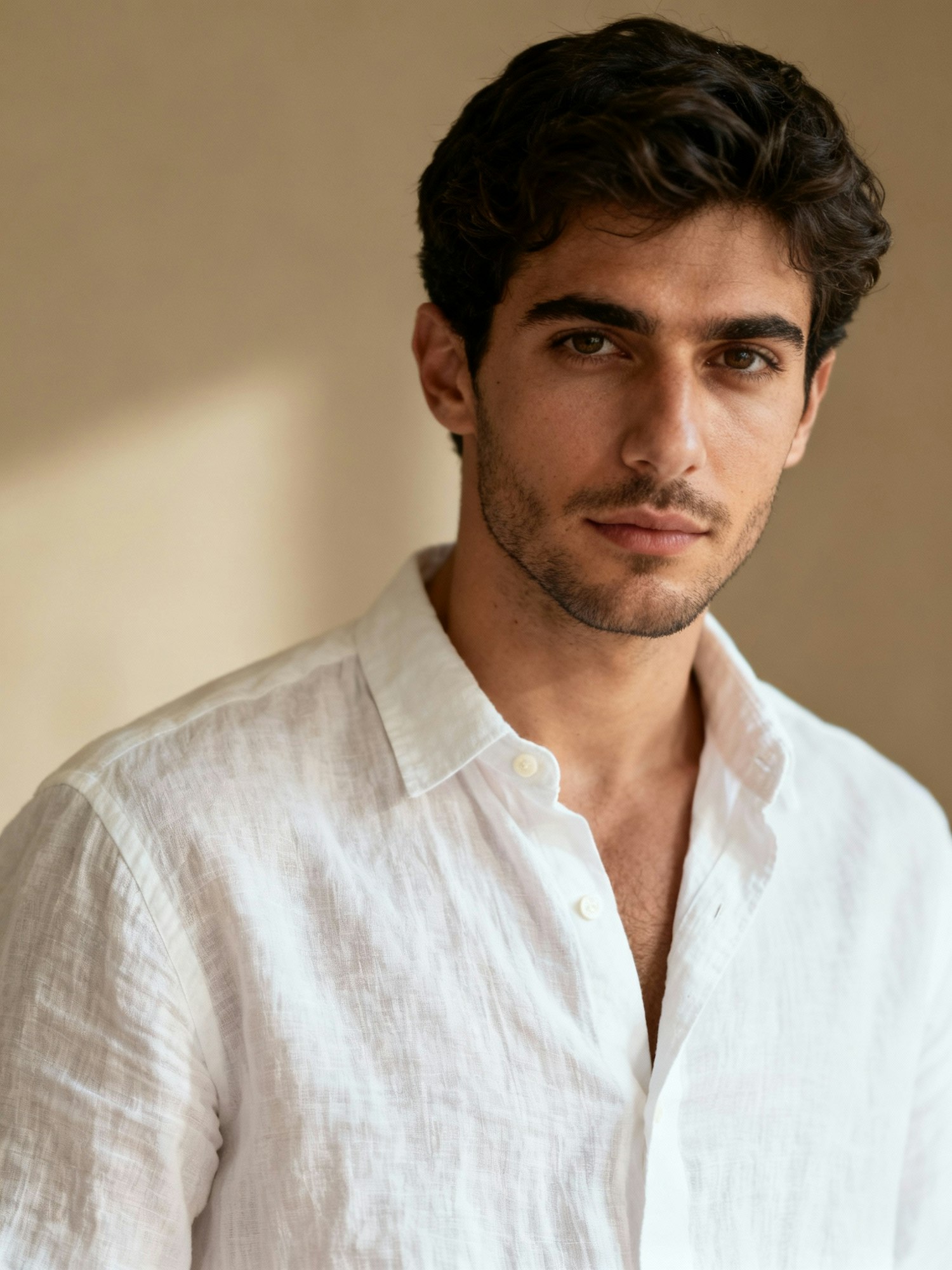 A man with dark wavy hair and a white shirt poses against a softly lit background, exuding a calm and composed demeanor.