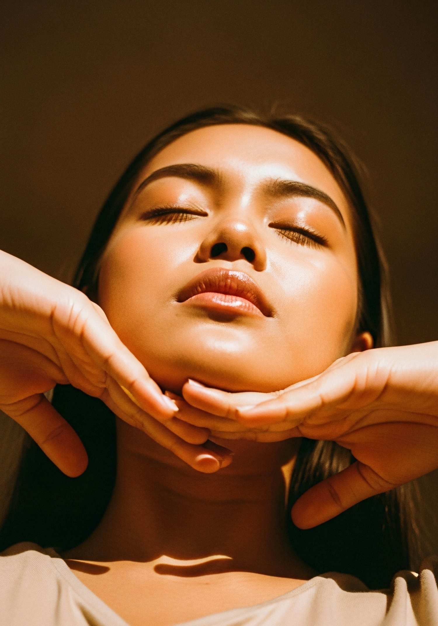 Close-up of a serene individual with warm lighting, eyes closed, and hands framing their face, creating a peaceful and radiant mood.