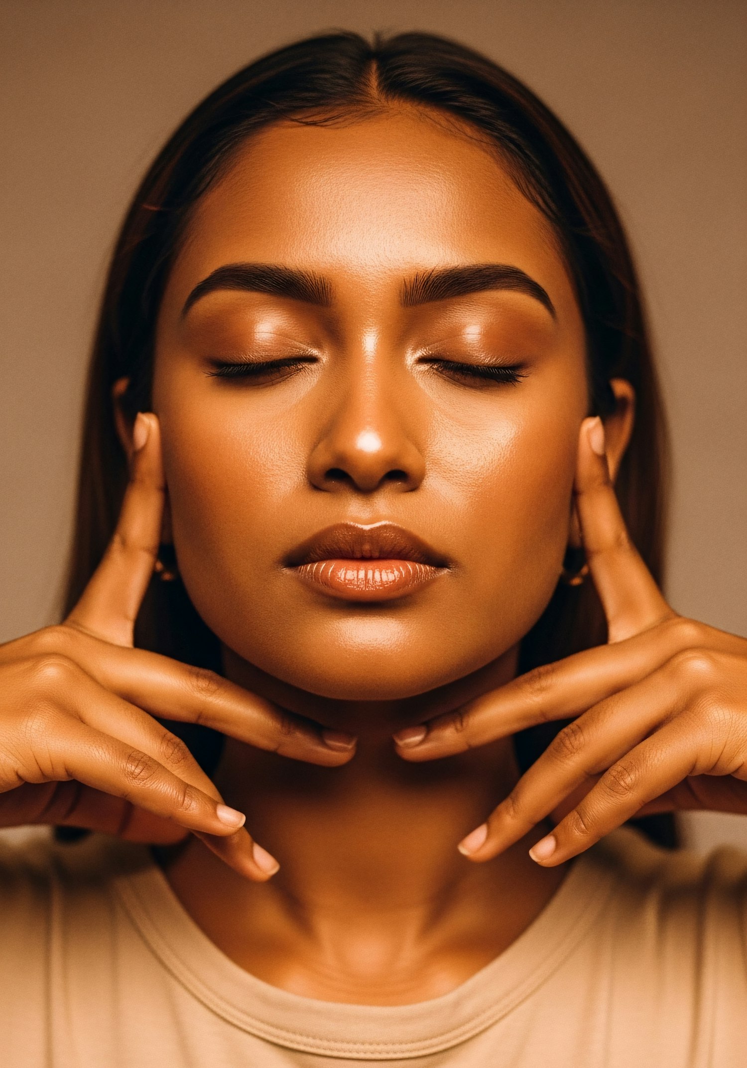 Close-up of a serene individual with glowing skin, closed eyes, and hands framing their face, set against a neutral background.