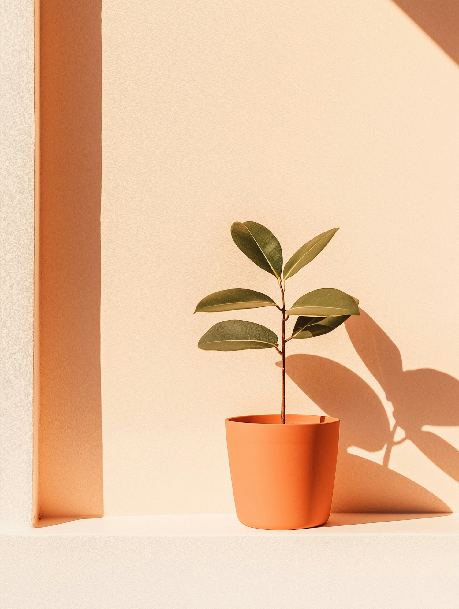 Minimalist potted plant in an orange pot against a peach wall, casting a striking shadow.