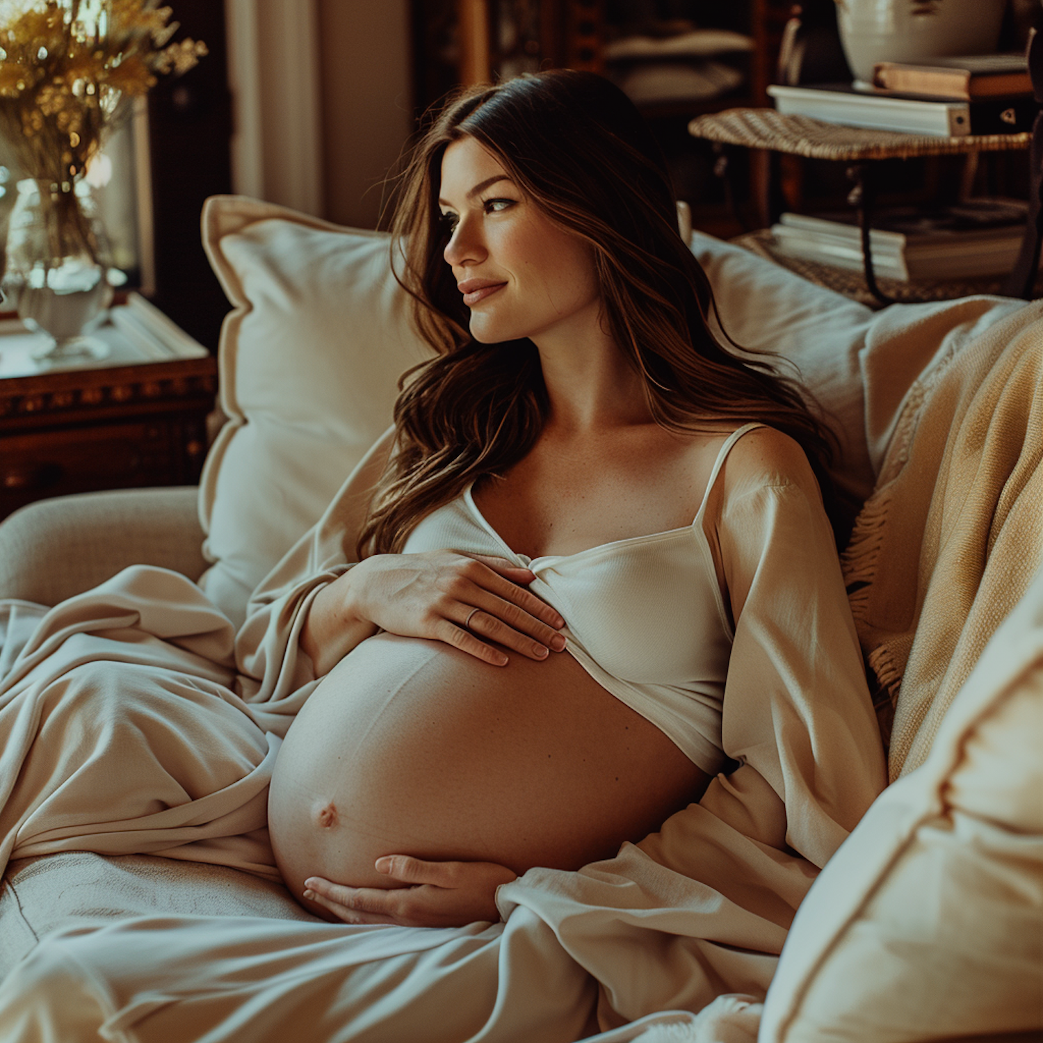 Pregnant woman with long brown hair cradles her belly on a cozy couch, surrounded by warm lighting and soft decor.