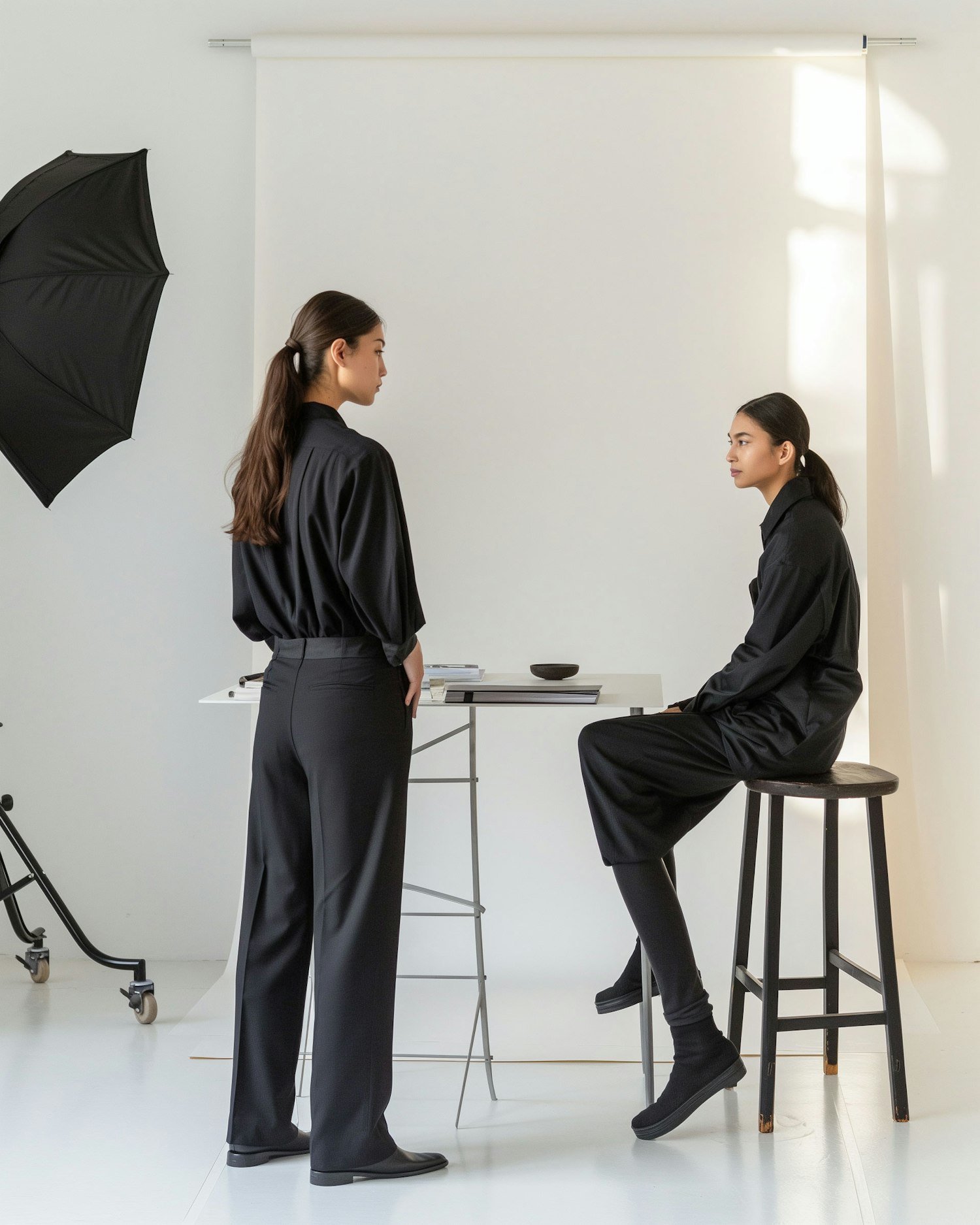 Two women in black outfits in a minimalist studio setting, one standing and one seated, with a photography backdrop and umbrella.