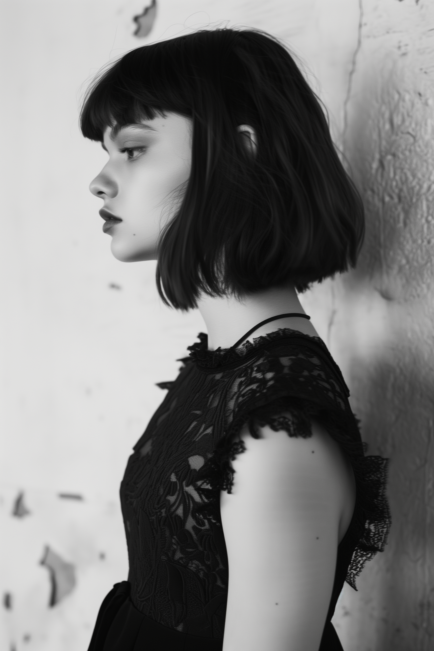 Monochrome profile of a young woman in a black lace dress, showcasing elegance and introspection against a textured wall.