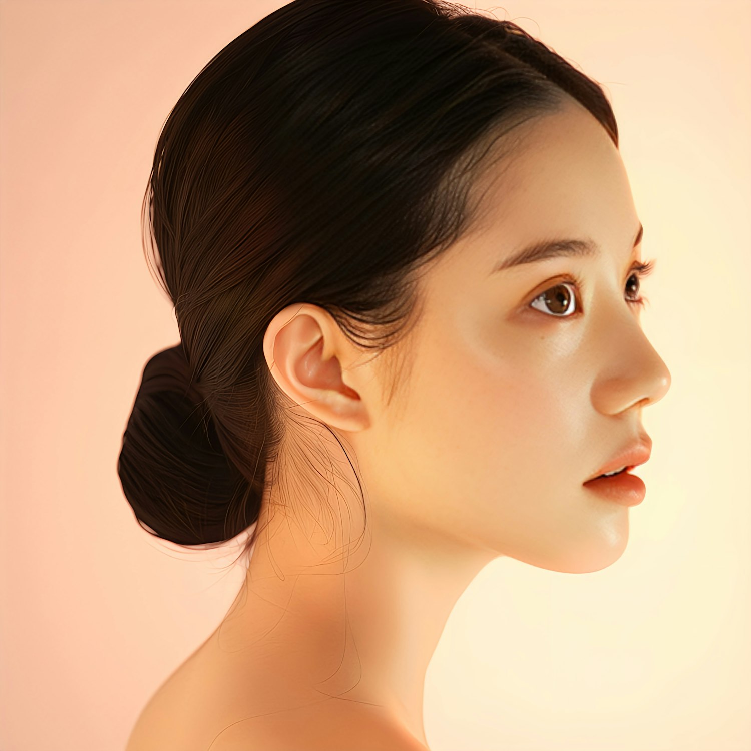 Profile of a young Asian woman with a serene expression, styled hair, and glowing skin against a soft peach background.