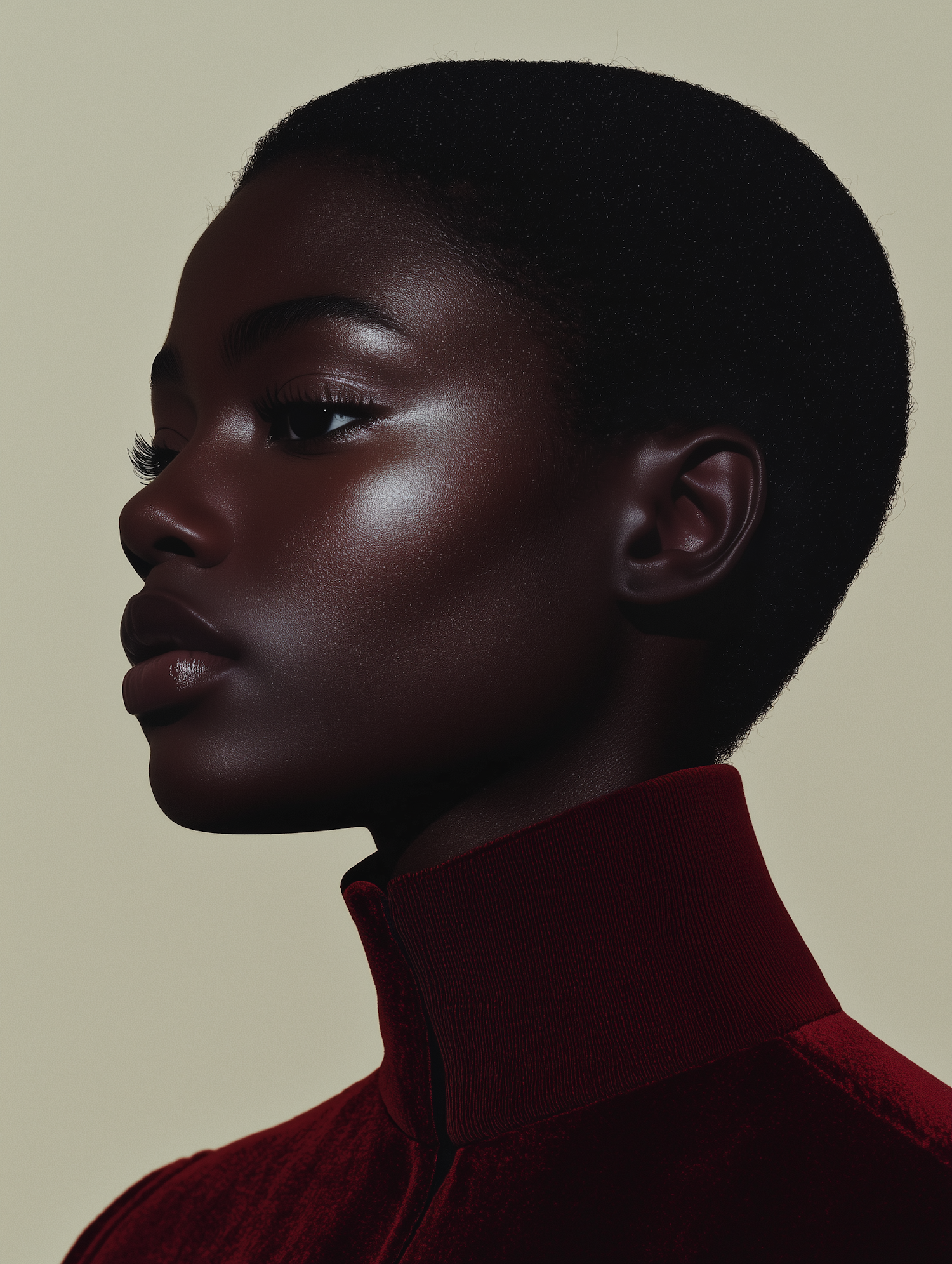 Elegant portrait of a Black woman in a red velvet top, showcasing her glowing skin and serene profile against a beige background.