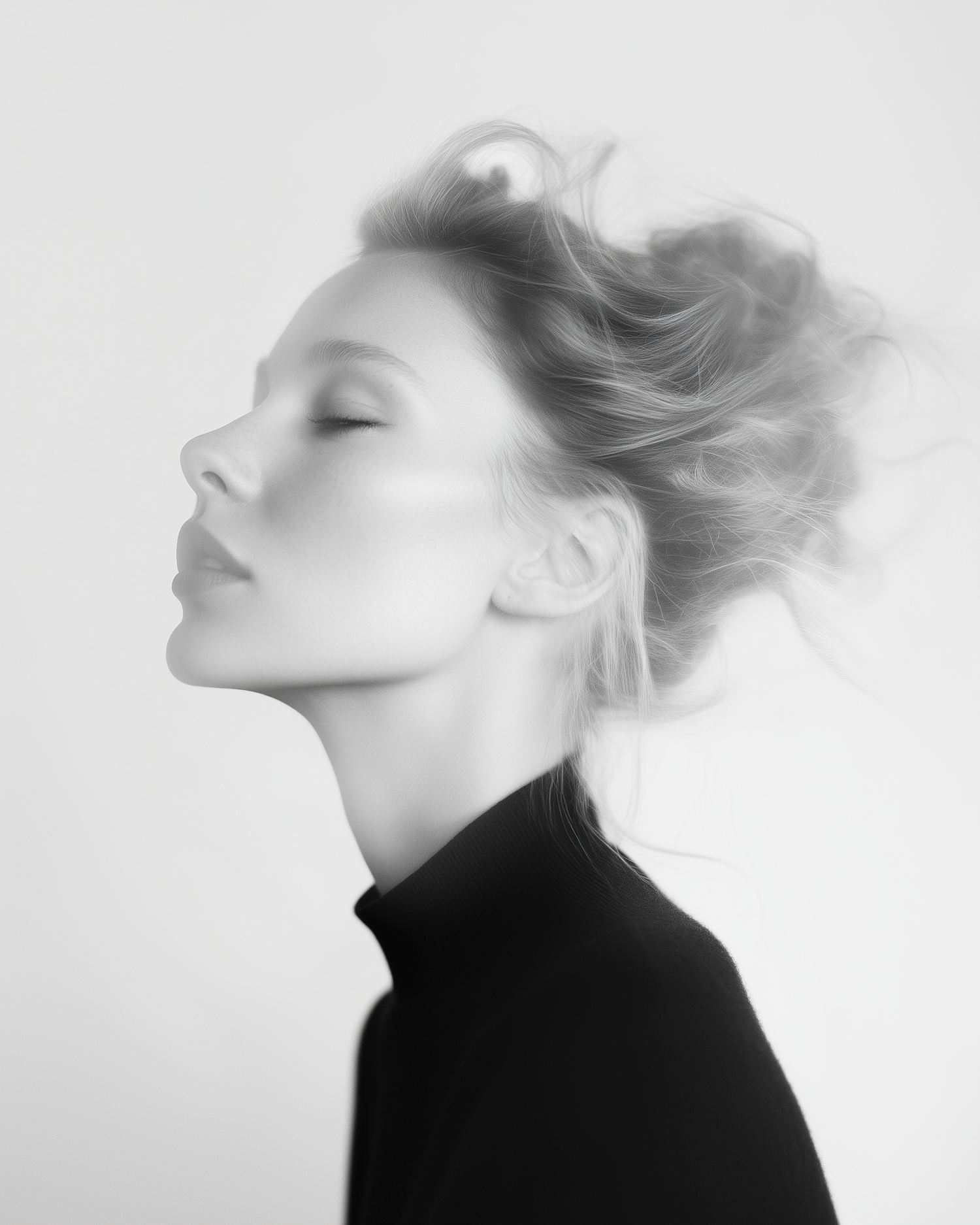 Elegant black and white portrait of a woman with closed eyes, highlighting serene beauty and soft lighting.