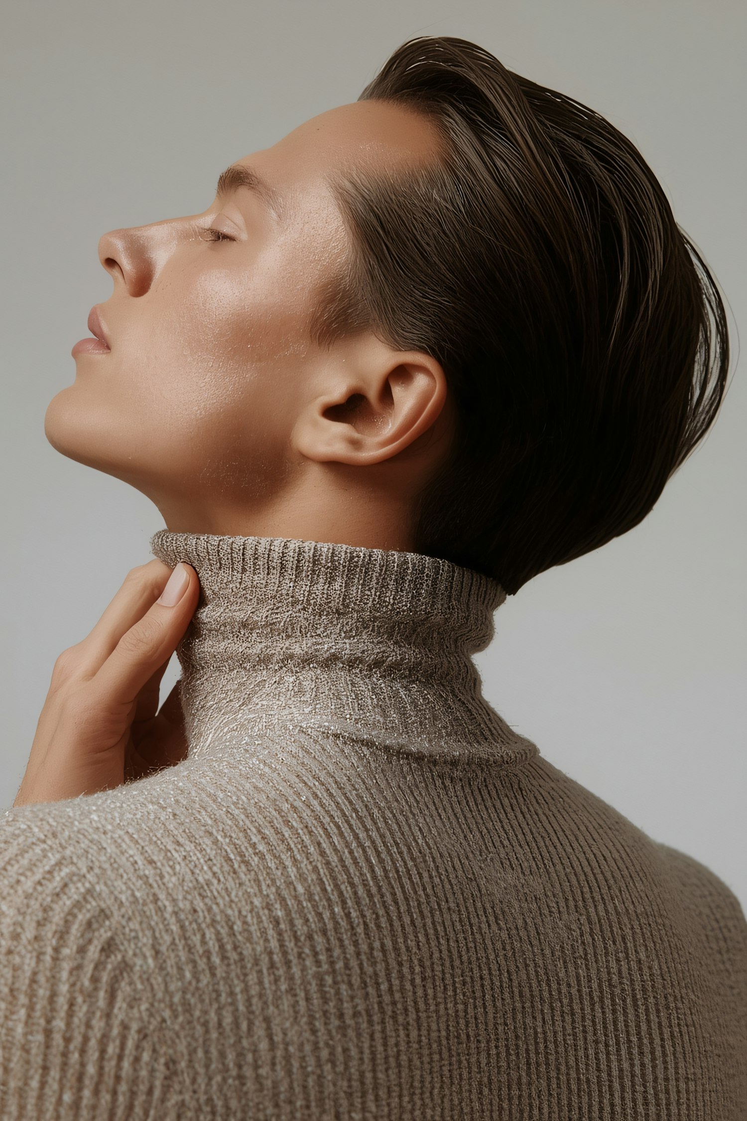 A serene profile portrait of a person in a beige turtleneck, showcasing smooth skin and sleek hair against a neutral background.