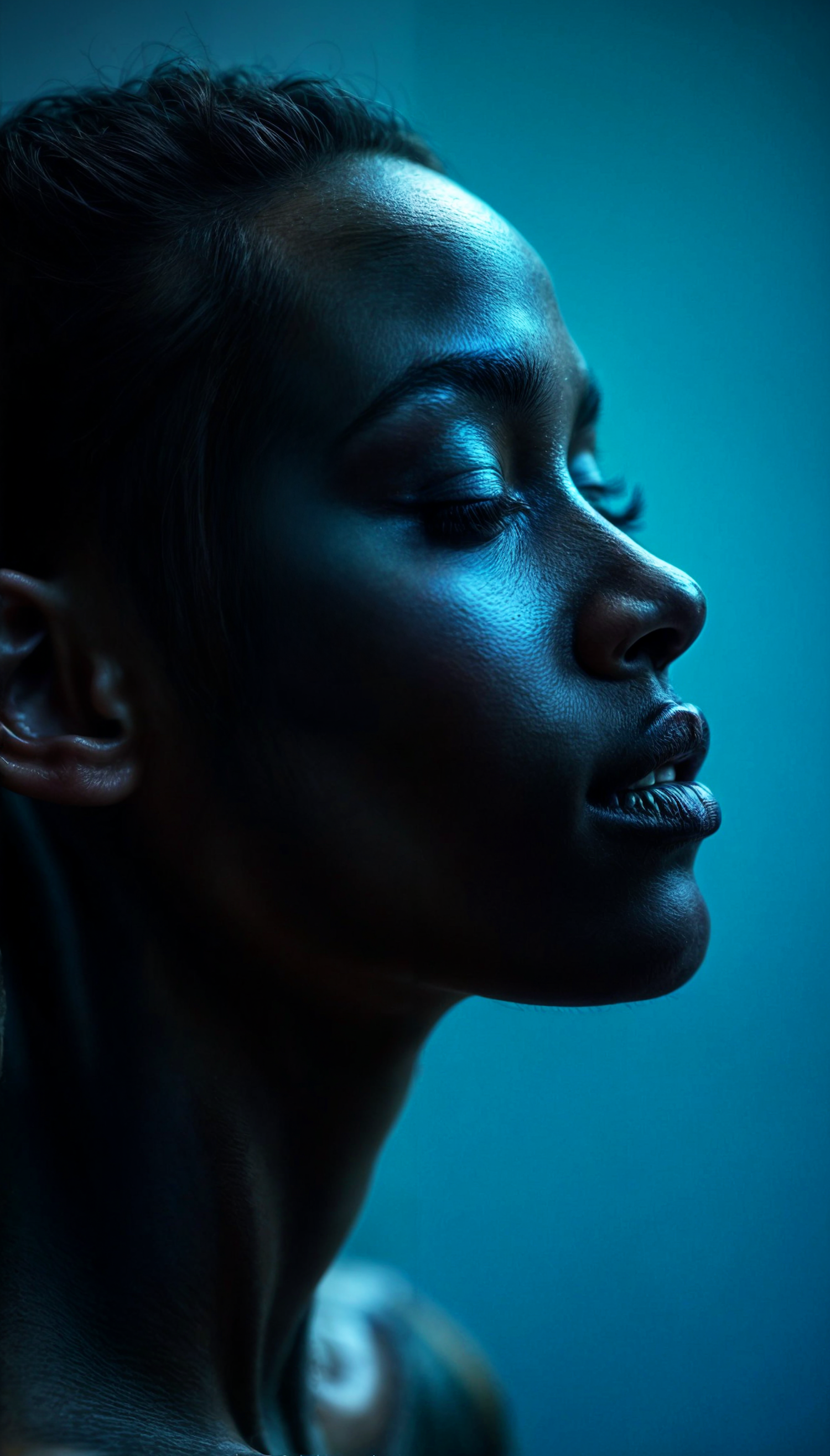 Close-up of a person's neck and ear with a cool blue hue, face obscured. Dramatic lighting highlights skin texture and hair.