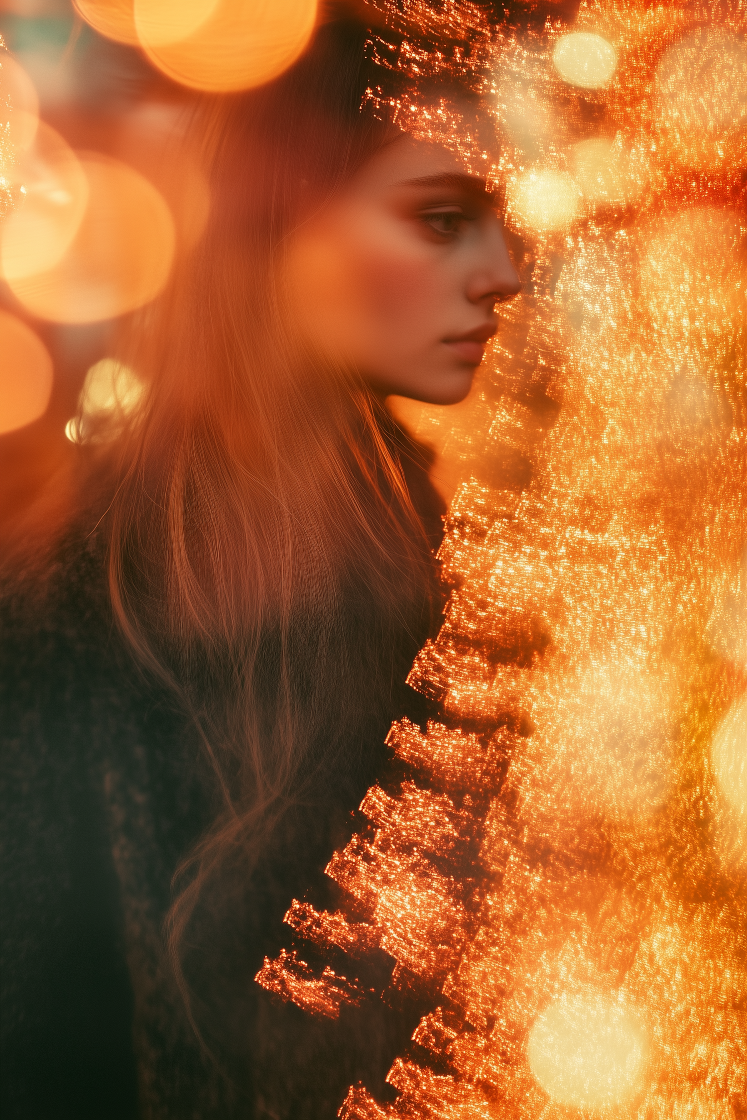 A serene woman in profile with flowing hair, surrounded by warm, golden bokeh lights, creating a dreamy, ethereal atmosphere.