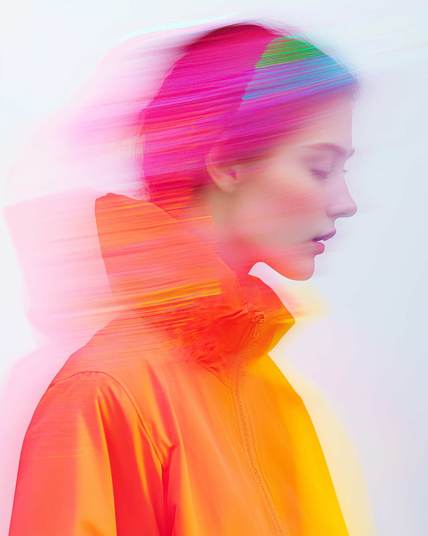 A serene profile of a woman with vibrant, blurred colors in pink, orange, and yellow, creating a dreamy, ethereal effect.