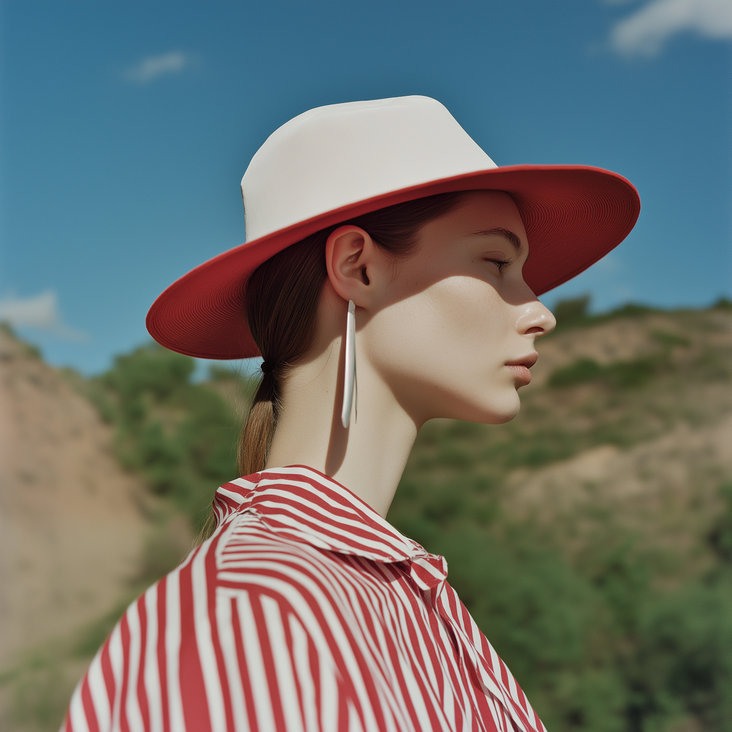 Stylish woman in a wide-brimmed hat and striped shirt, set against a clear blue sky and natural backdrop.