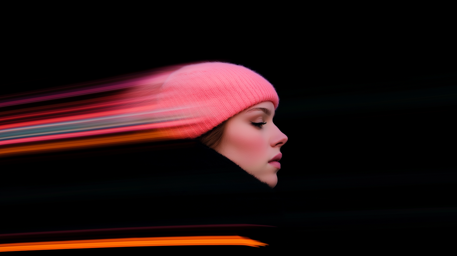 Profile of a serene woman in a pink beanie with colorful streaks, creating a dynamic and modern visual effect.