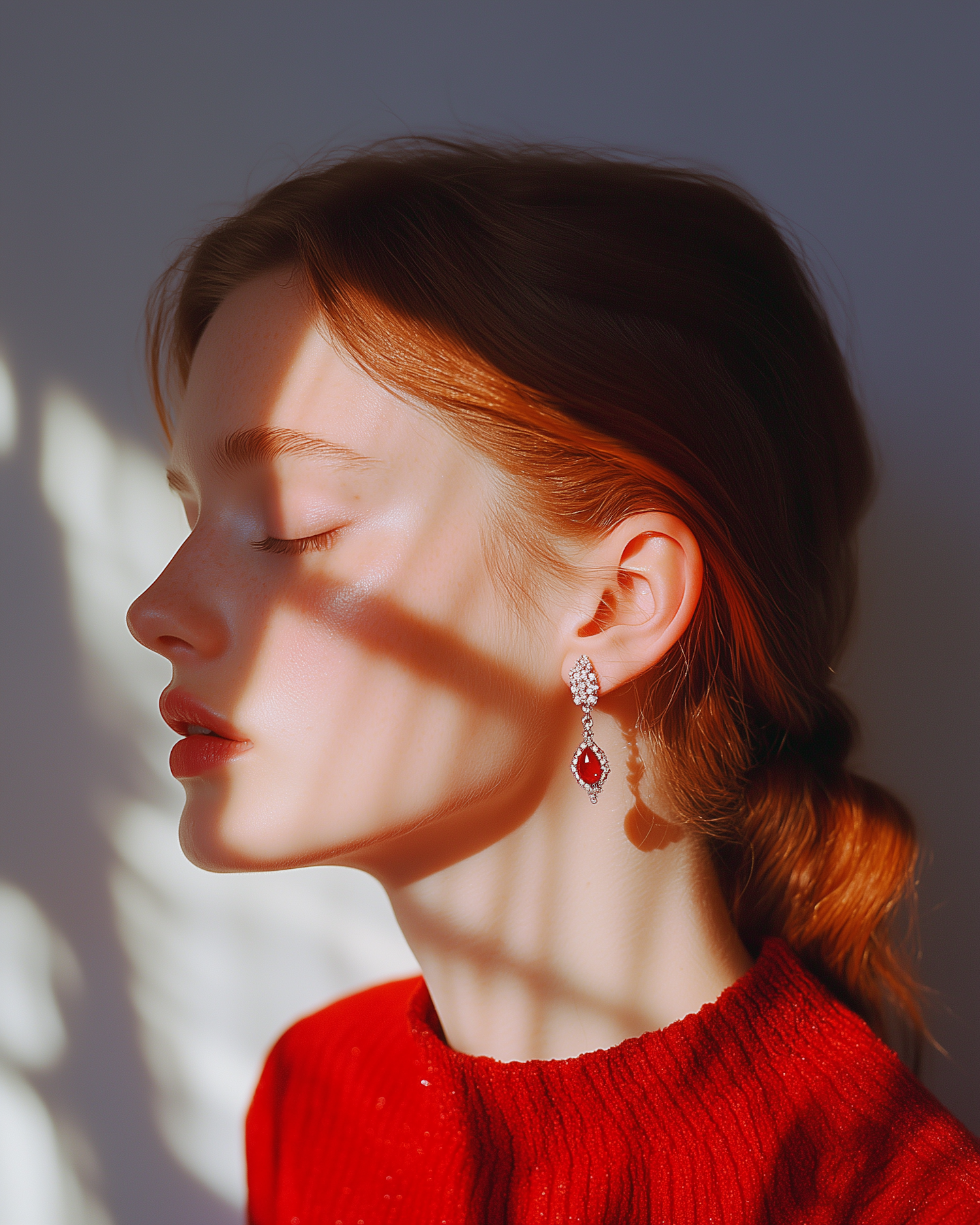 Profile of a serene woman with auburn hair, wearing red gemstone earrings and a red sweater, bathed in soft sunlight.