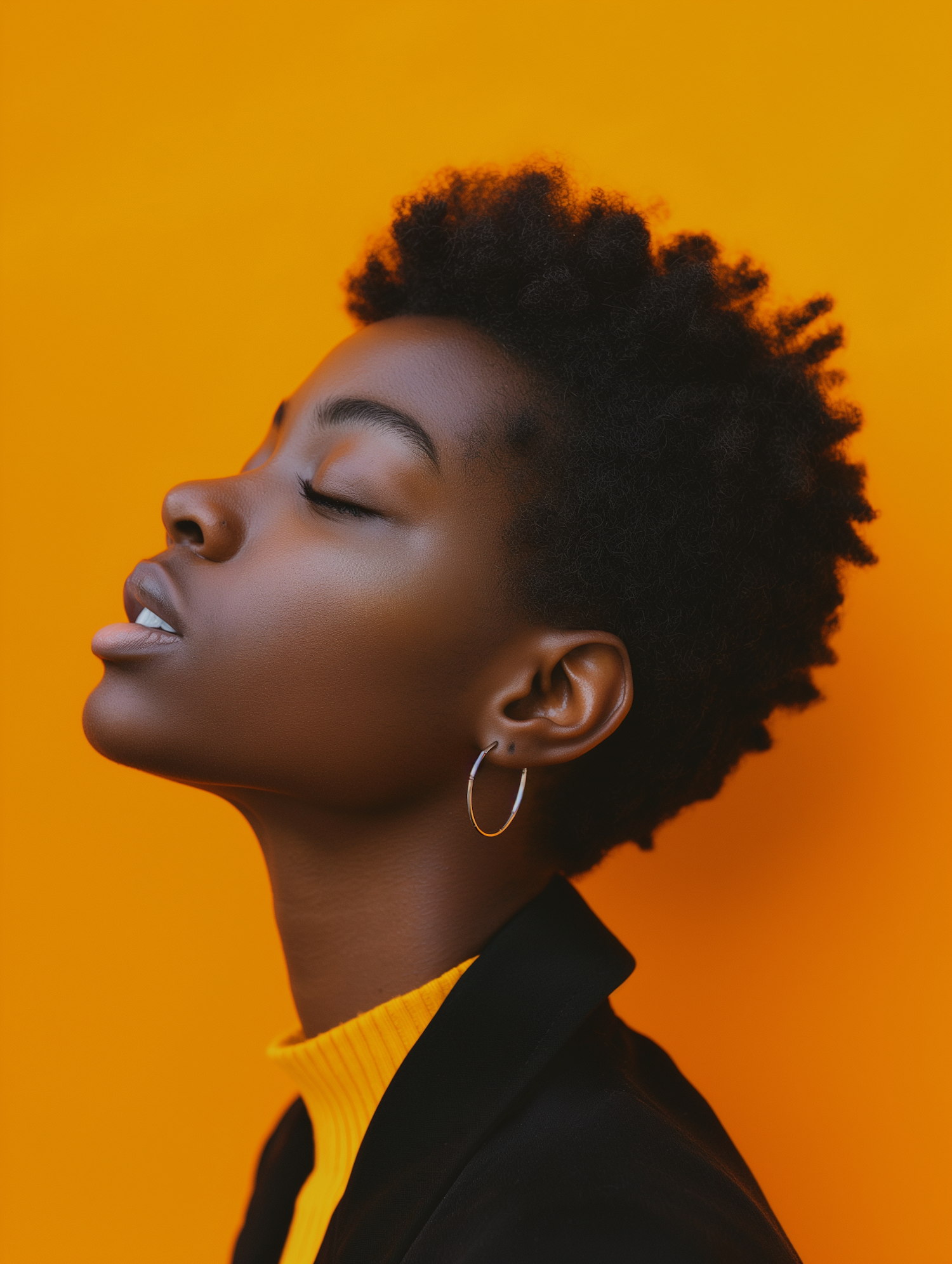 Profile of a serene Black woman with natural hair against a vibrant orange background, wearing a yellow turtleneck and hoop earring.