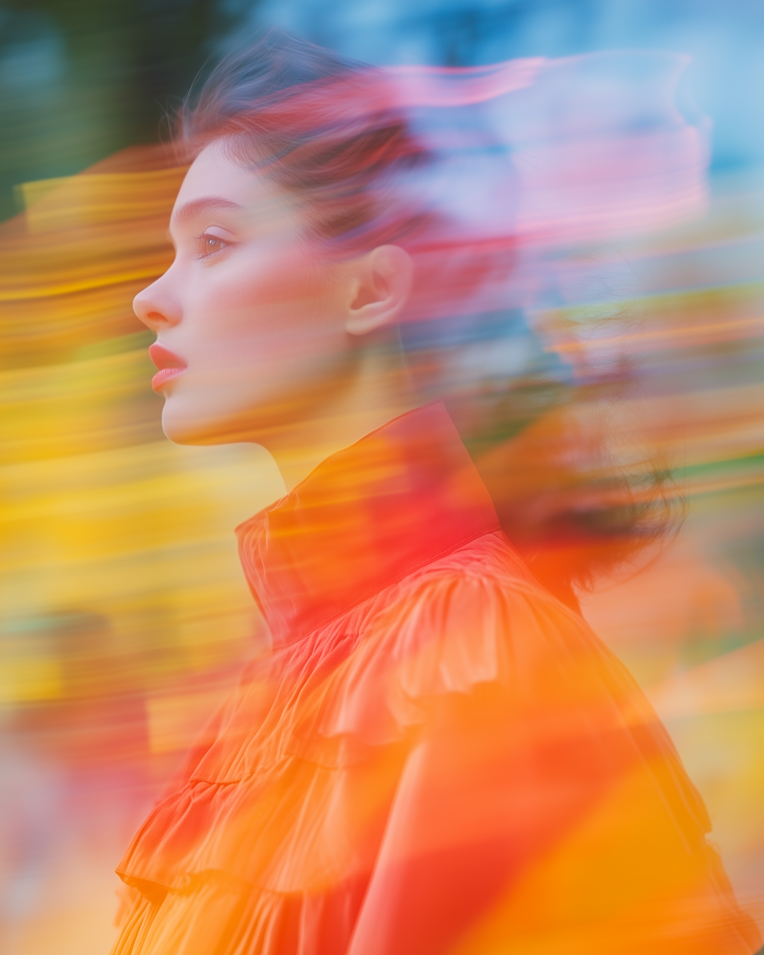 A serene woman in an orange ruffled top surrounded by dynamic swirls of yellow, orange, and blue, creating an abstract, artistic scene.