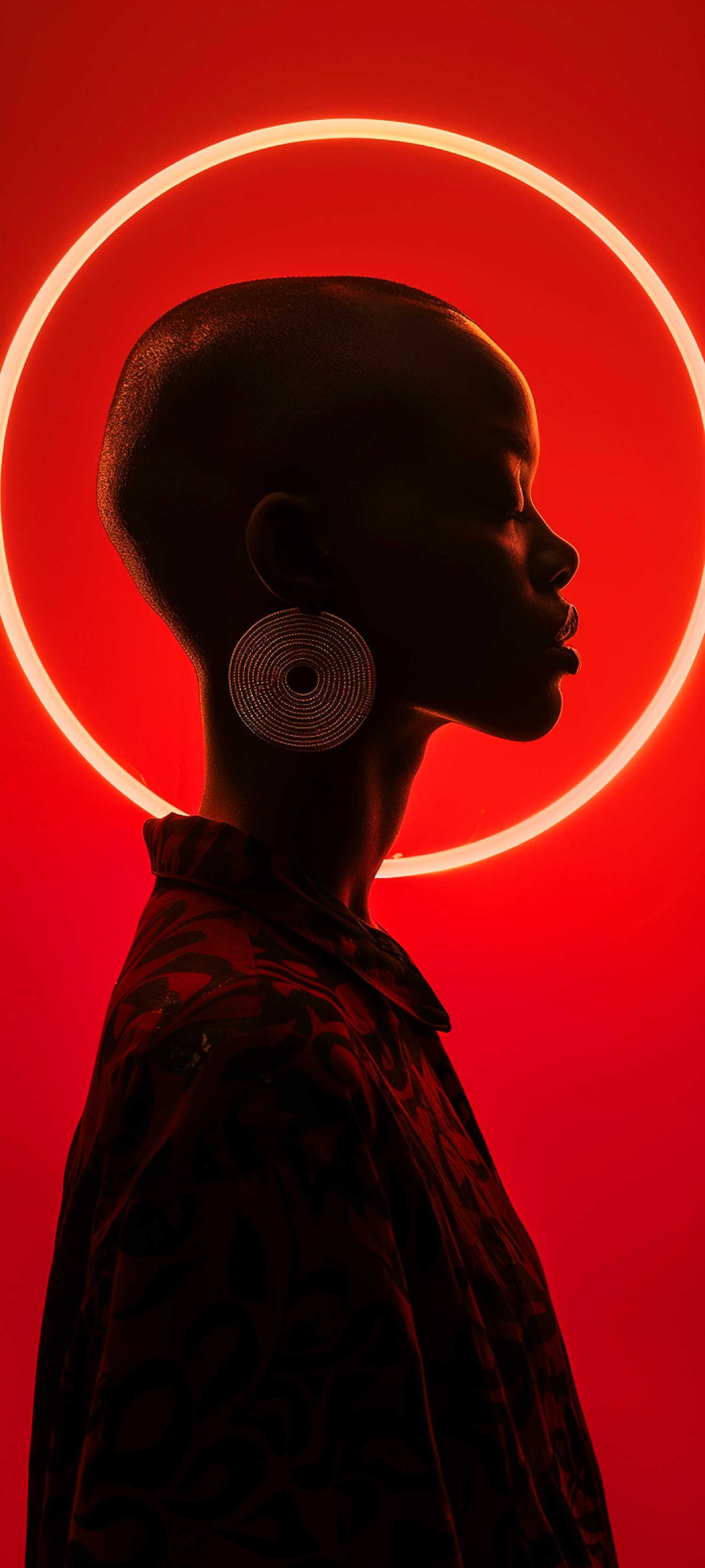 Profile portrait of a woman with shaved head, halo lighting, and bold red background, wearing large circular earrings.