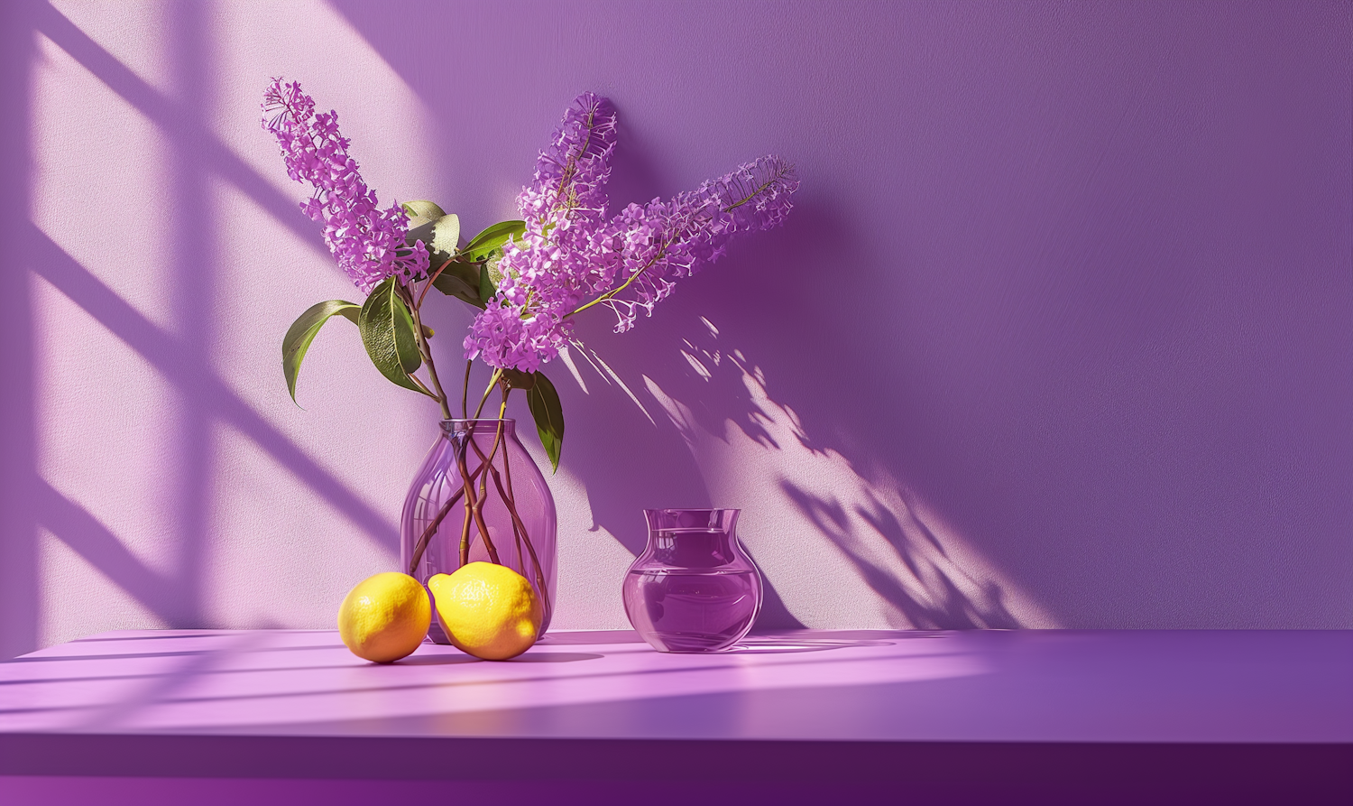 Purple-themed still life with lilac flowers, lemons, and glass vases on a sunlit purple surface.