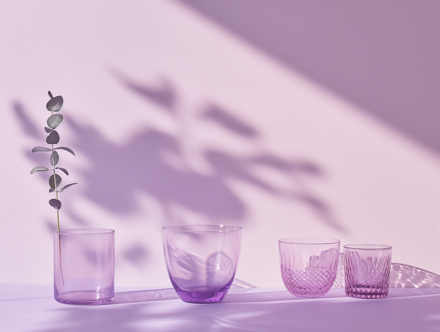 Elegant purple glassware with eucalyptus branch against a lavender backdrop, showcasing minimalist design and light play.