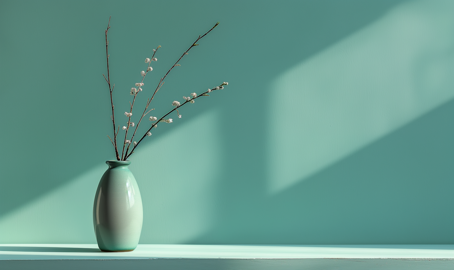 Minimalist teal vase with branches and blossoms against a teal background, casting soft shadows for a serene aesthetic.