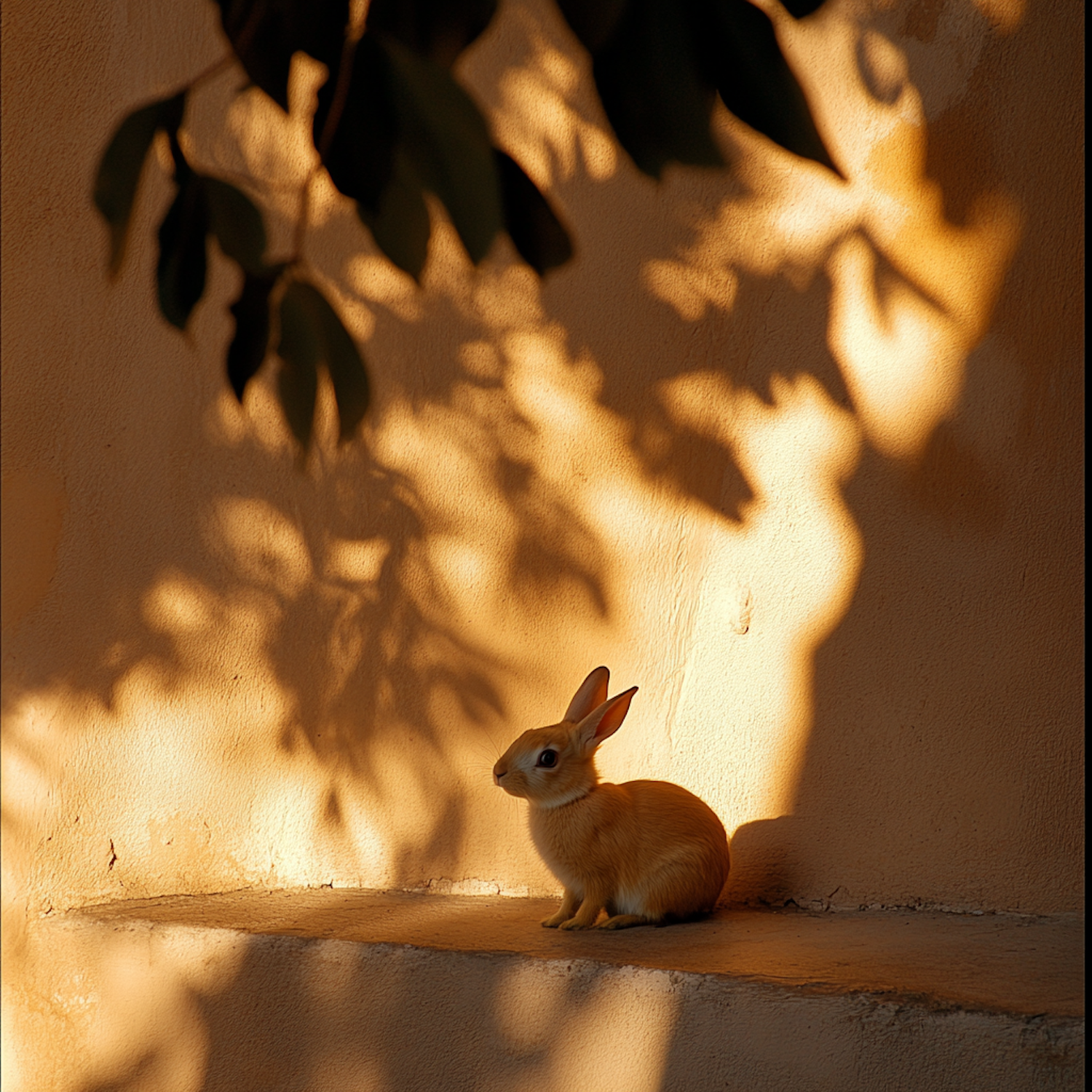 A rabbit sits in warm sunlight, surrounded by leaf shadows on a beige wall, creating a serene and peaceful scene.