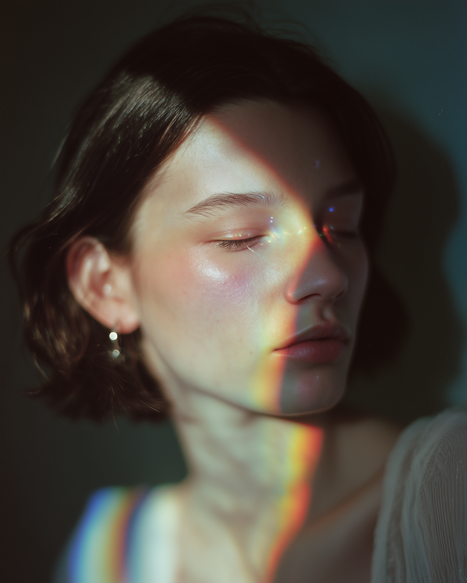 Close-up of a serene woman with a rainbow light effect on her face, creating a dreamy and artistic atmosphere.