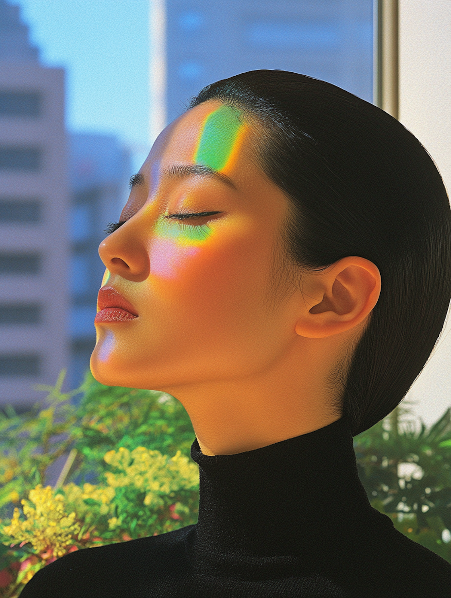 A serene portrait of a woman with a rainbow reflection on her face, set against a blurred urban and natural background.