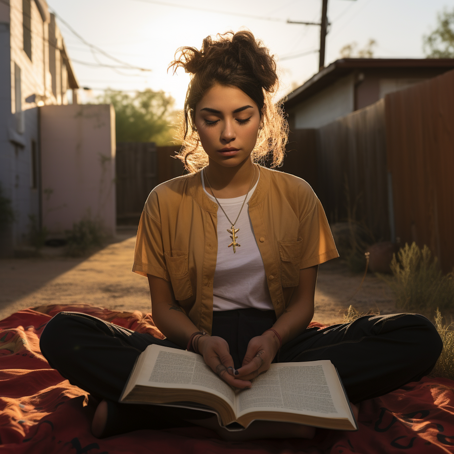 Young woman meditating with a book in a sunlit alley, wearing a yellow shirt and gold necklace, eyes closed in peaceful reflection.