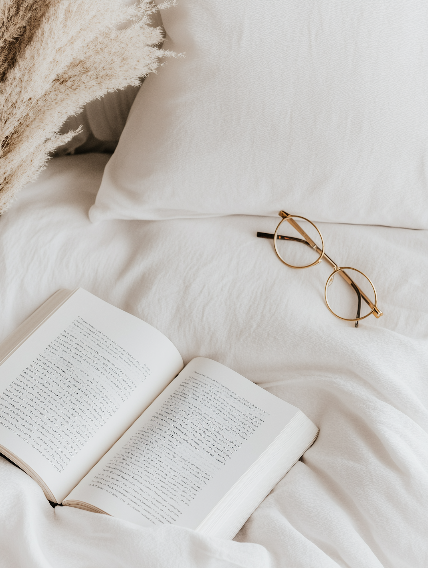 Cozy reading scene with an open book, gold-rimmed glasses, and pampas grass on a white bedspread.