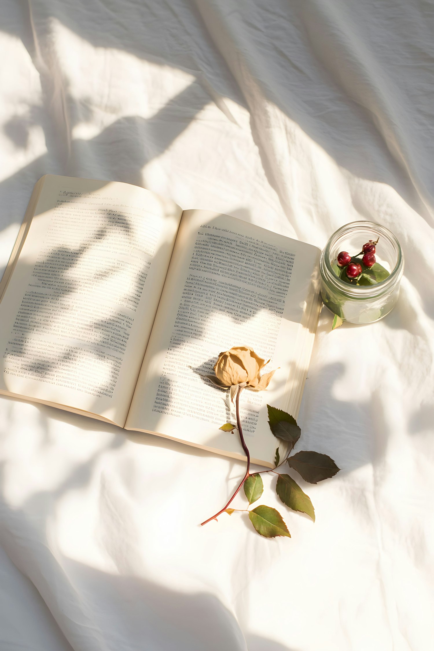 Open book with a dried rose and a jar of red berries on white fabric, bathed in soft natural light and leaf shadows.