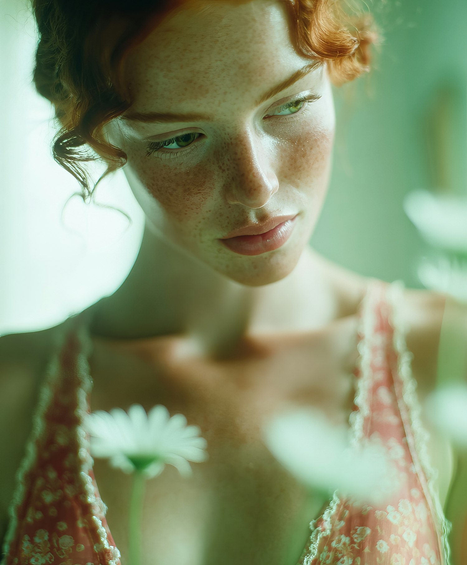 A serene portrait of a freckled red-haired woman in soft light, surrounded by daisies, evoking a tranquil and natural ambiance.
