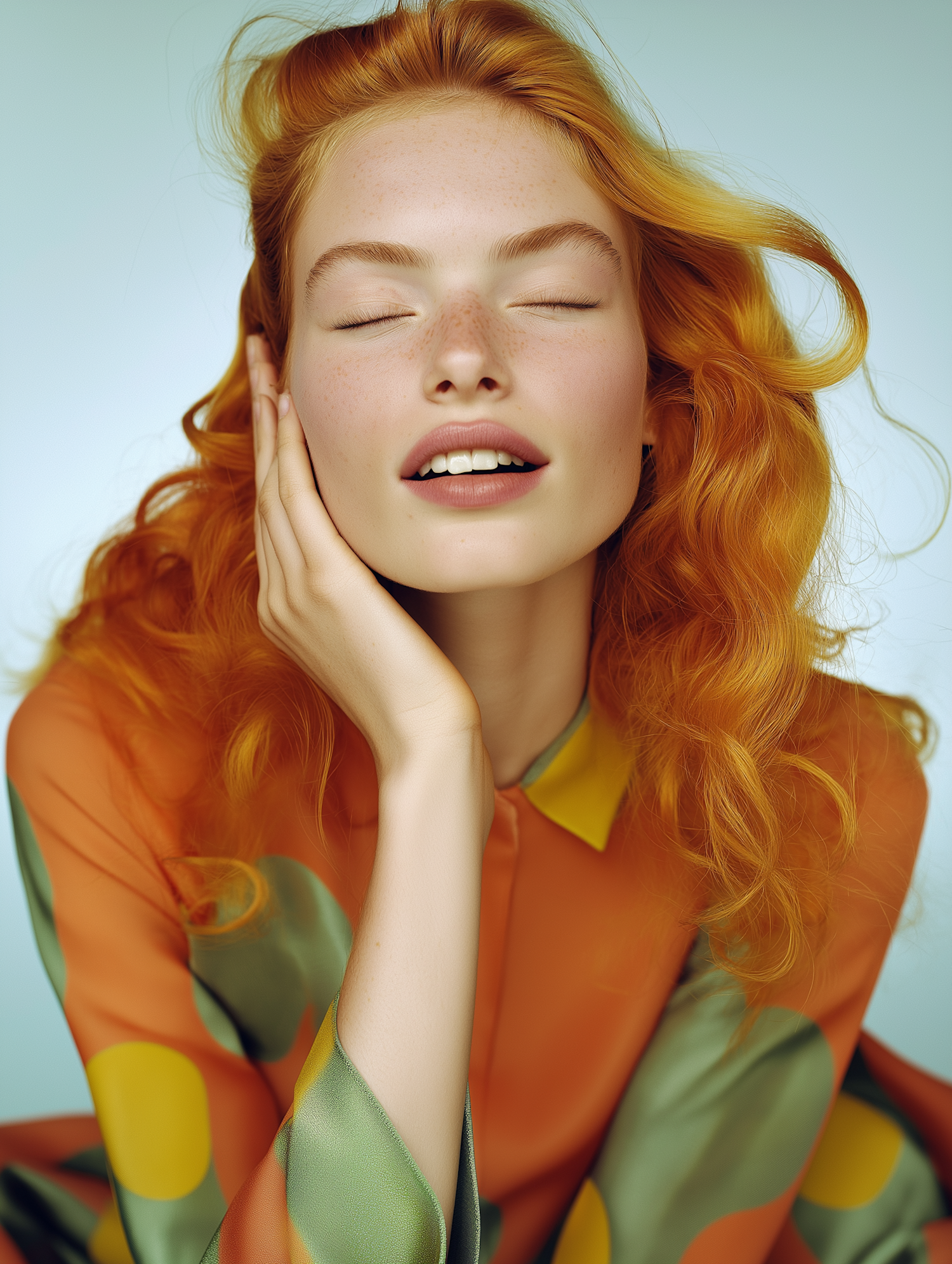 Serene portrait of a red-haired woman in a colorful polka dot blouse, eyes closed, exuding tranquility and elegance.