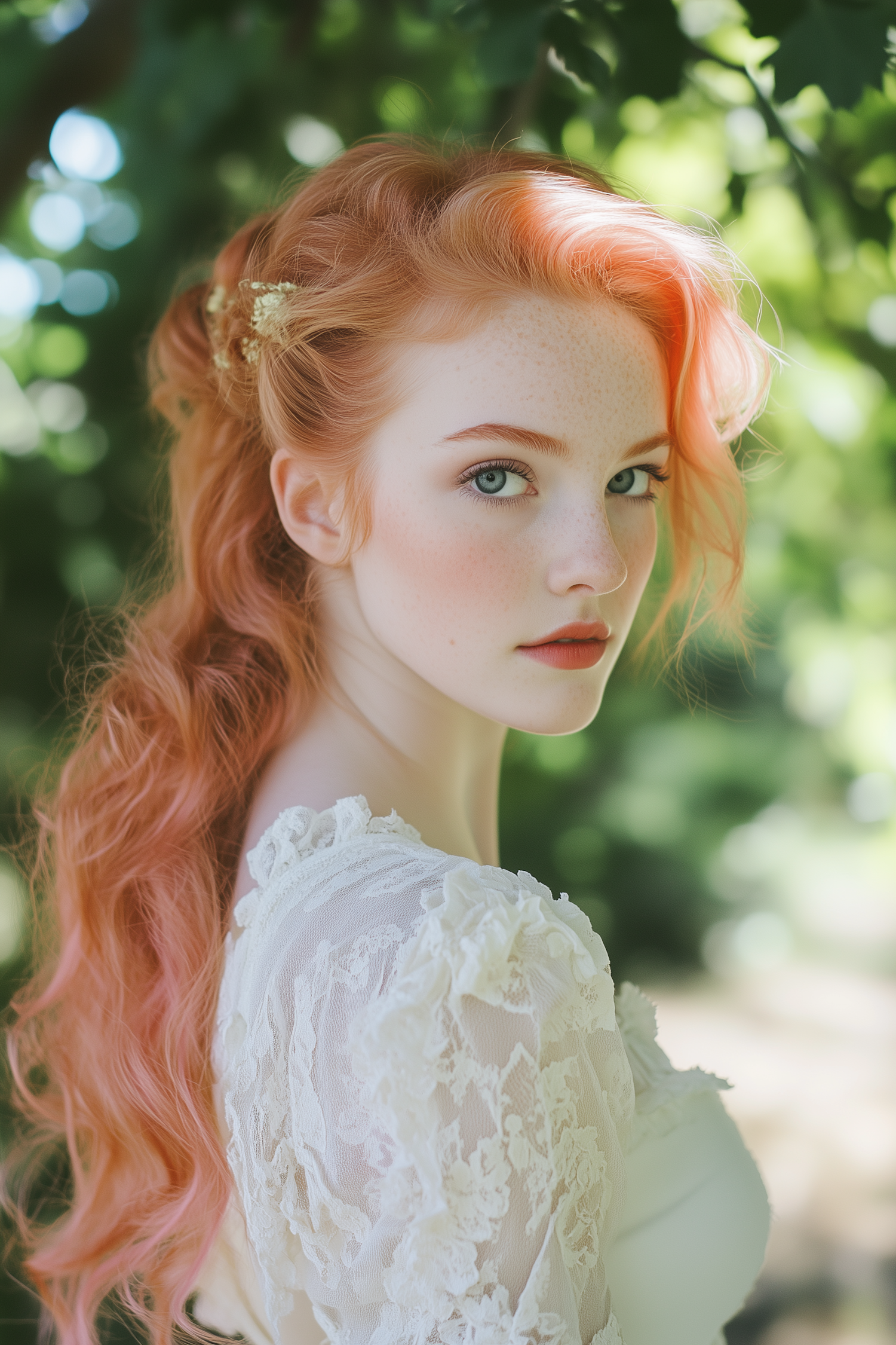 Elegant woman with red hair in a white lace dress, standing in a sunlit garden, exuding grace and serenity.