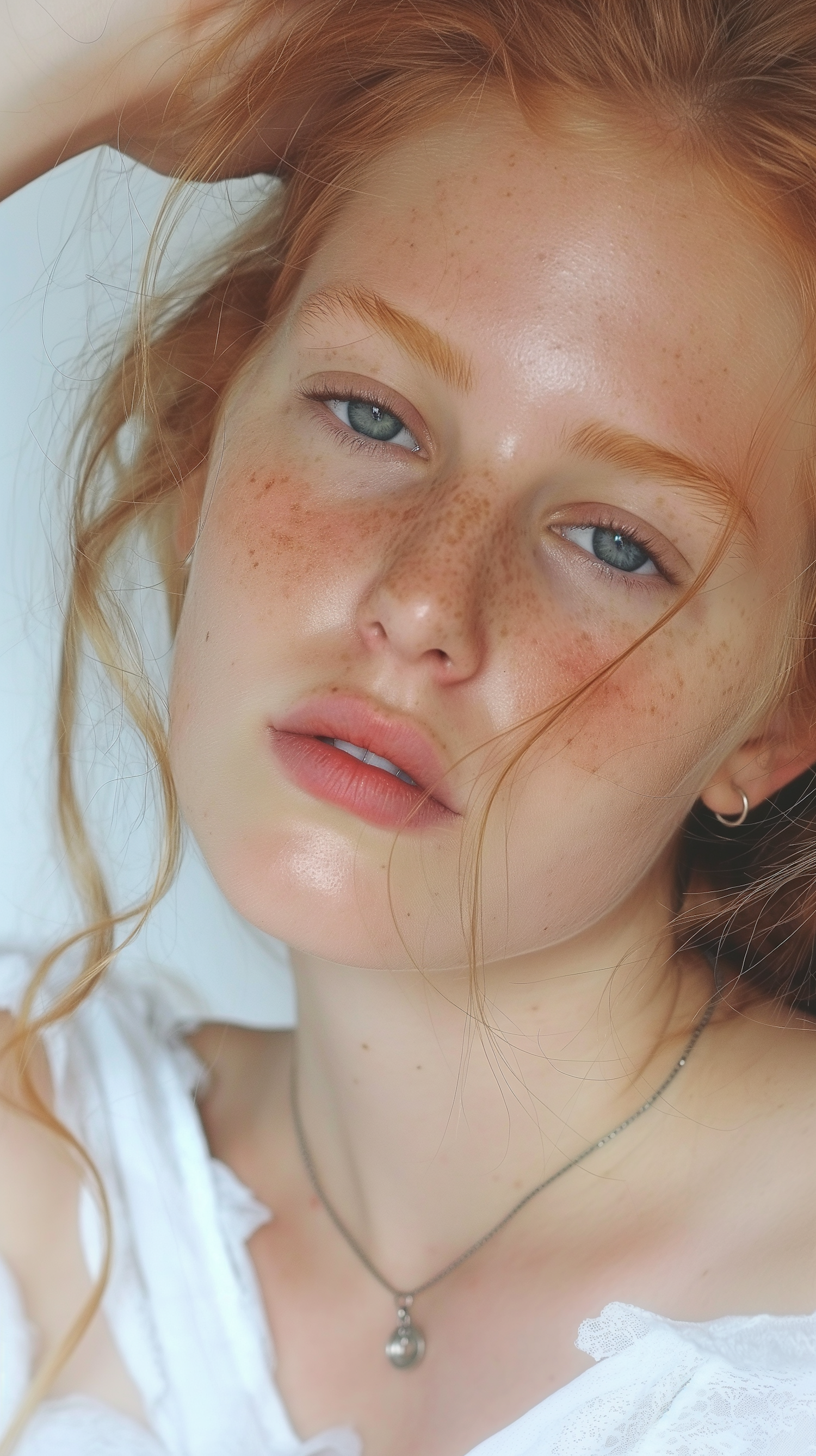 Close-up portrait of a young woman with red hair, blue eyes, and freckles, wearing a white top and necklace.