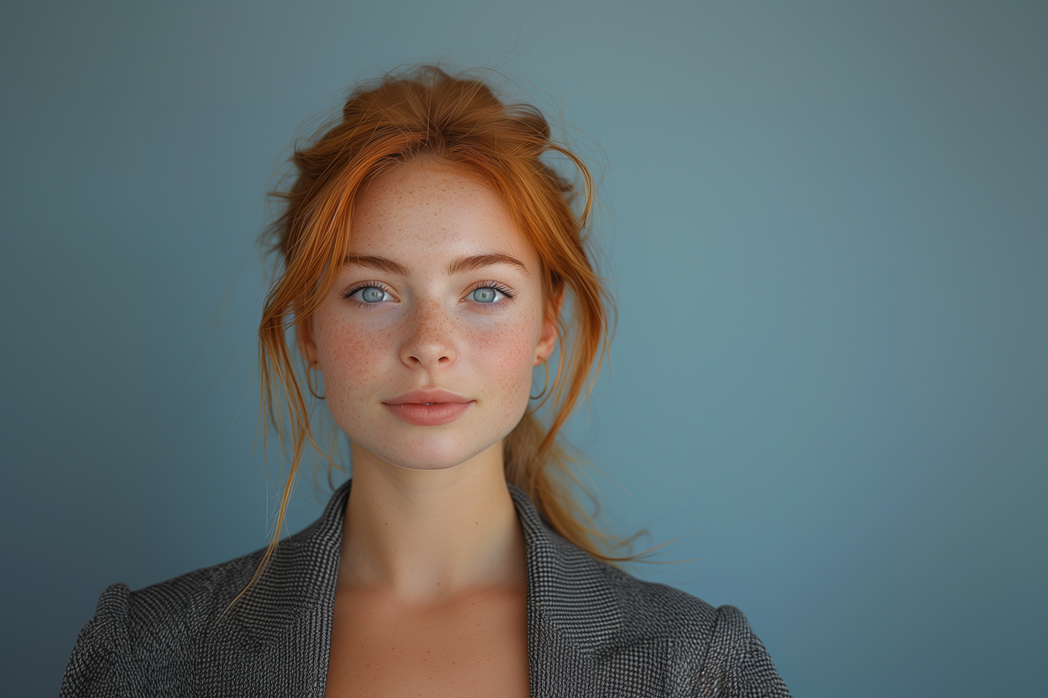 Portrait of a young woman with red hair and blue eyes, wearing a gray blazer against a muted blue background.
