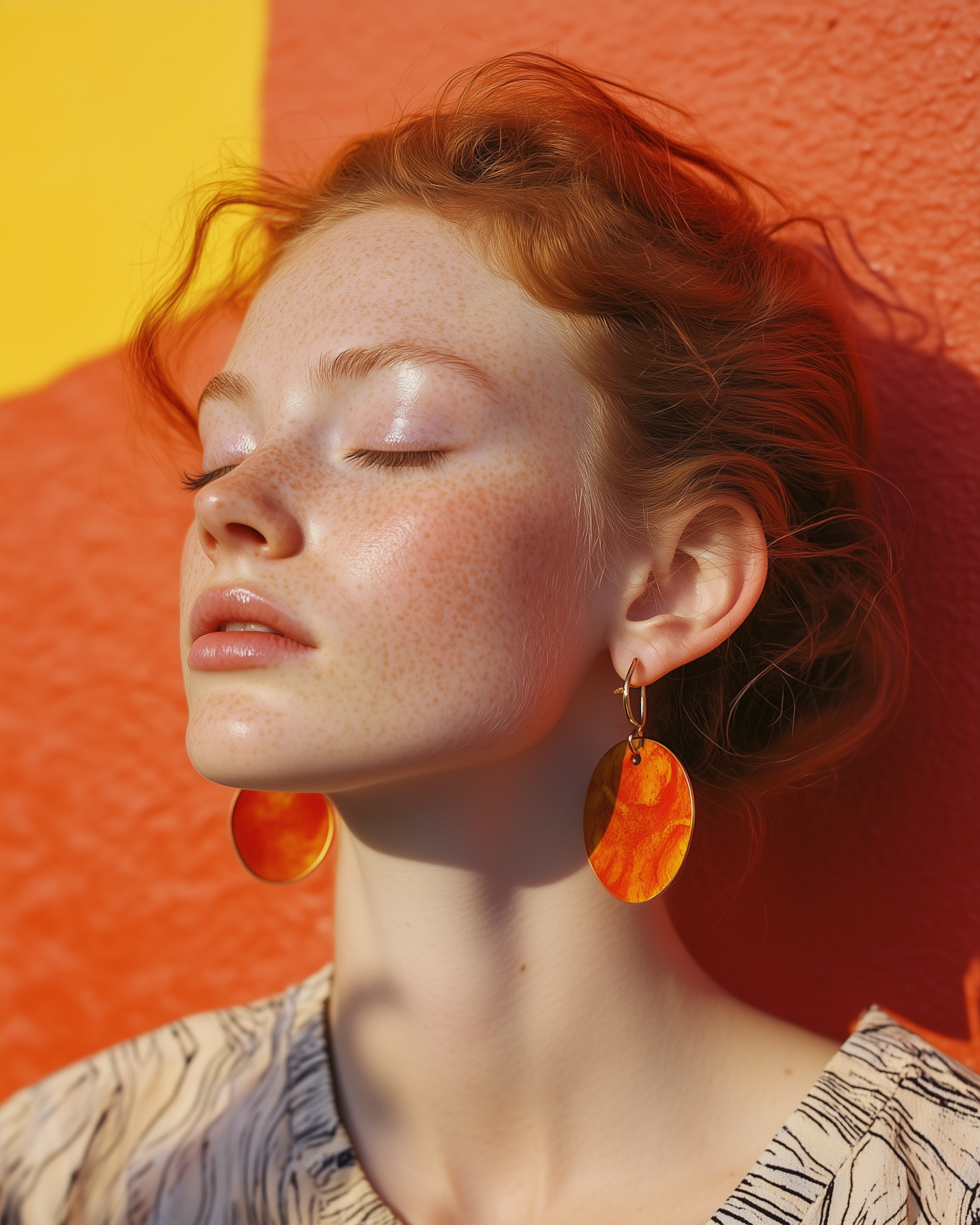 Serene portrait of a freckled woman with red hair, orange earrings, and a vibrant orange-yellow background.