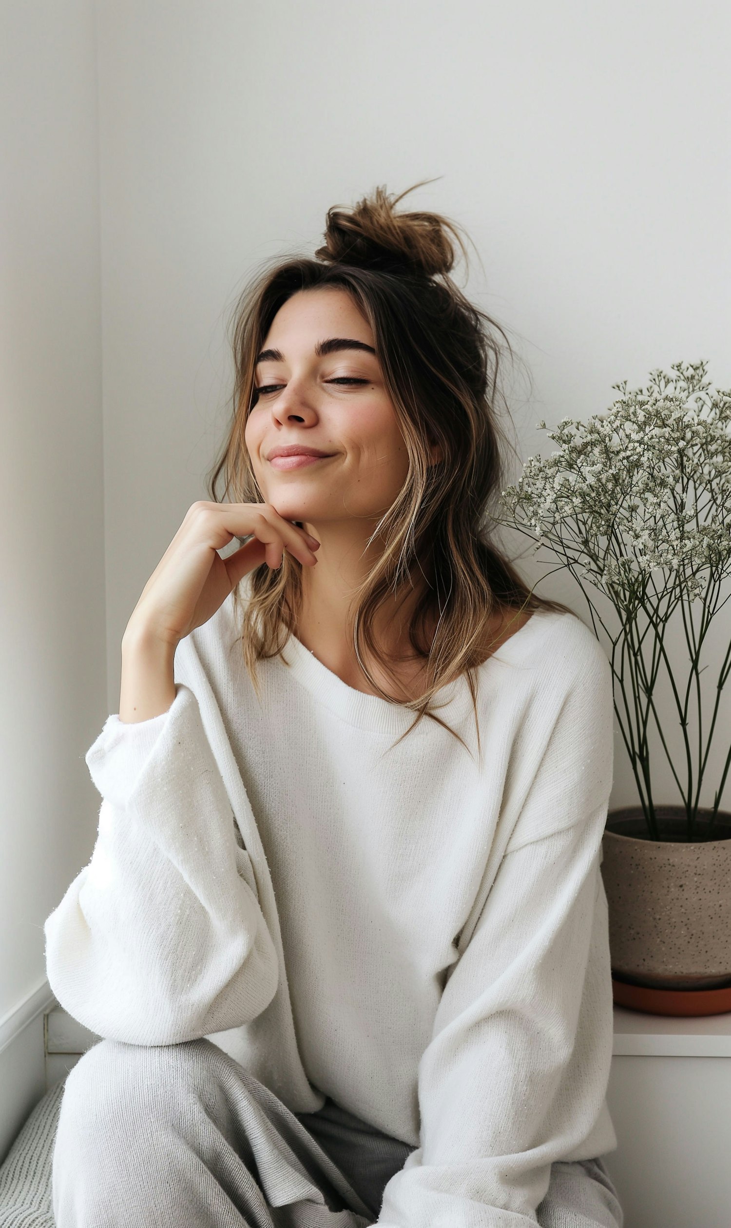 Serene woman in cozy white sweater, eyes closed, sitting by a potted plant with delicate flowers. Relaxed and peaceful vibe.