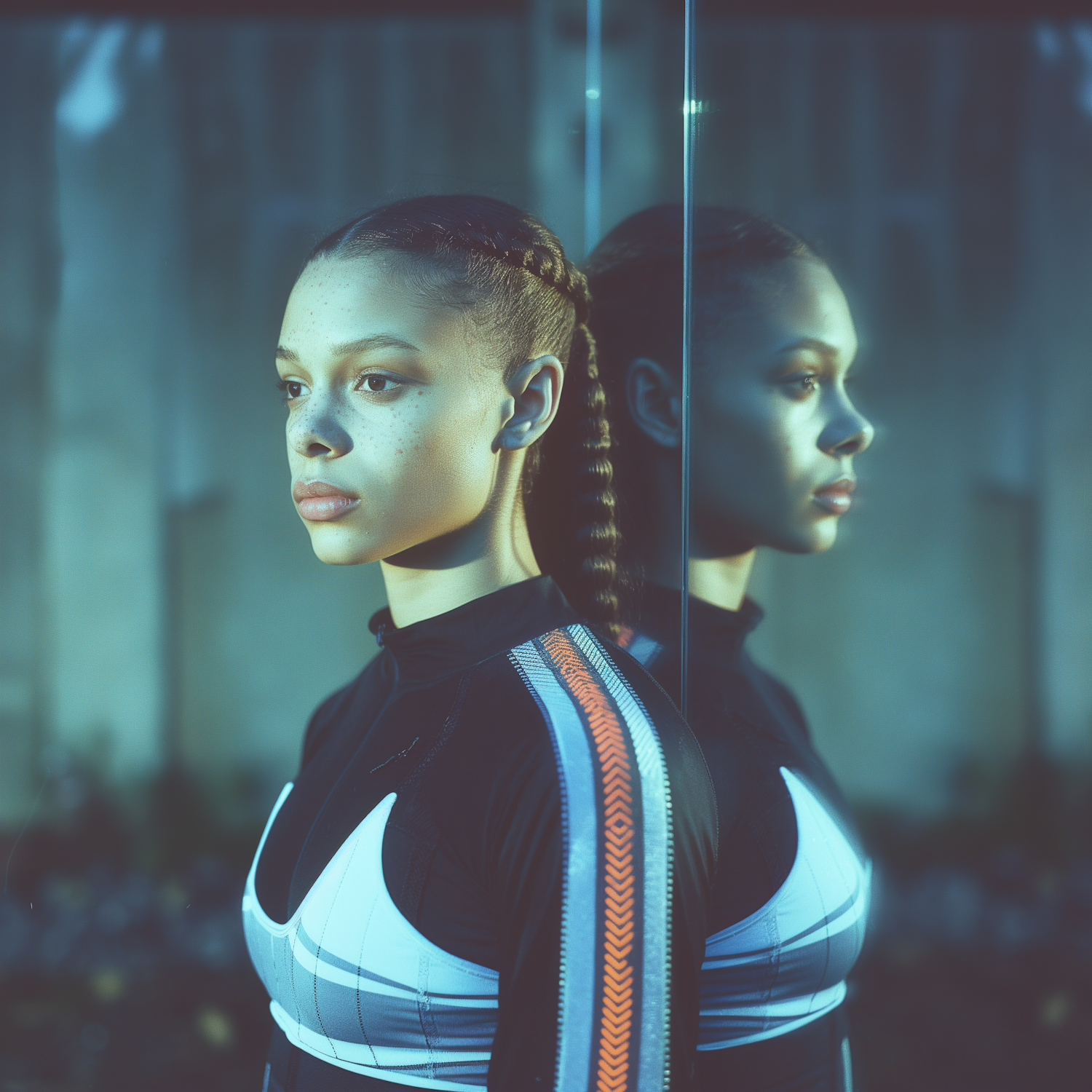 Young woman with braided hair and freckles in sporty attire, reflected in glass. Cool lighting creates a serene atmosphere.