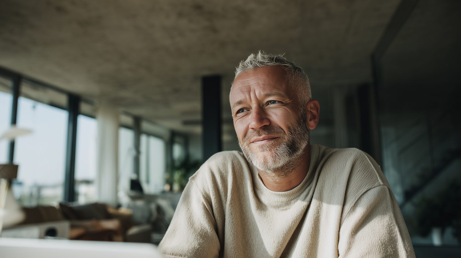 A middle-aged man with gray hair and a beard sits in a modern, sunlit room, wearing a beige sweater and looking thoughtful.