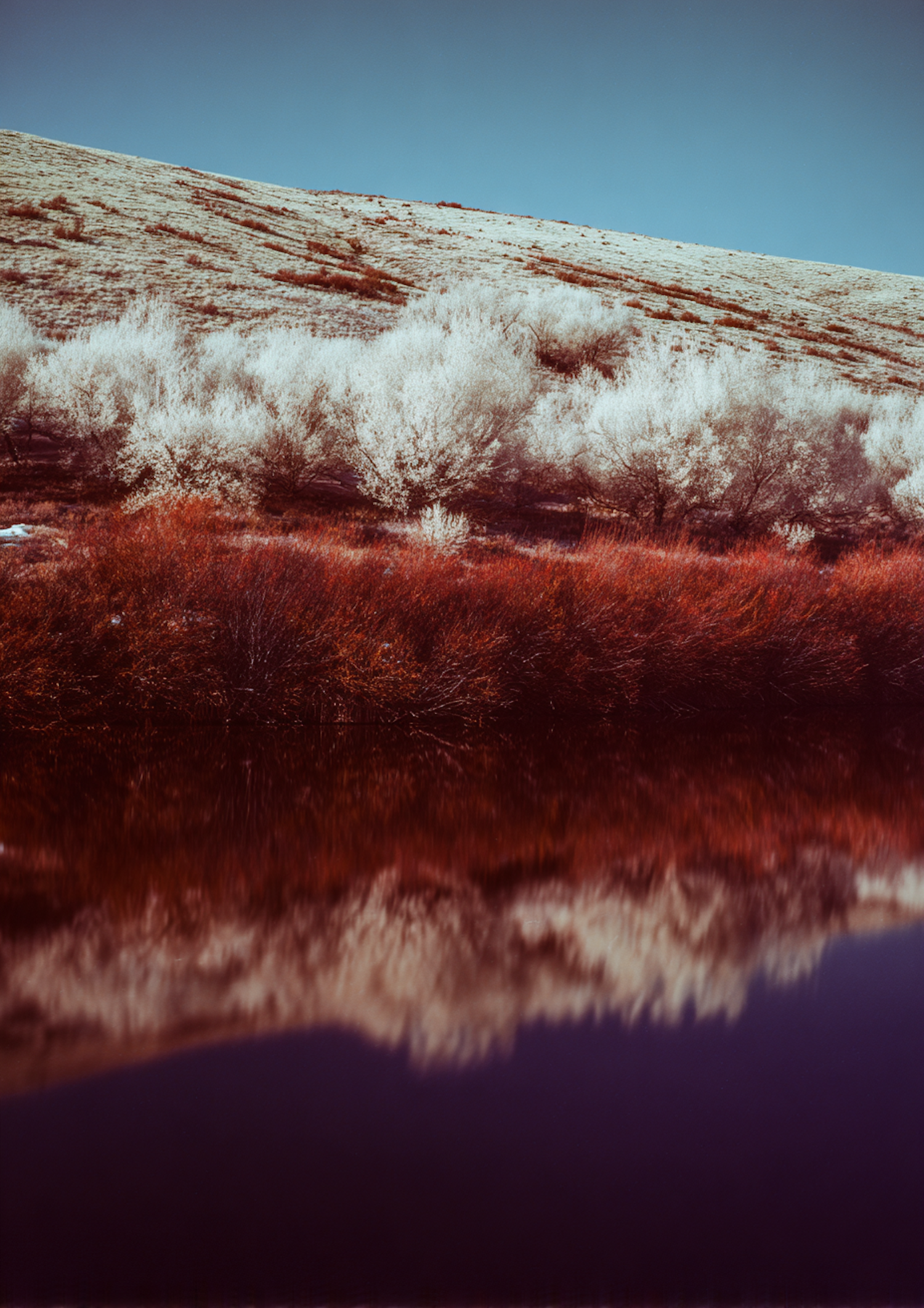A tranquil landscape with a reflective lake, vibrant red and white foliage, and a gentle hill under a clear blue sky.