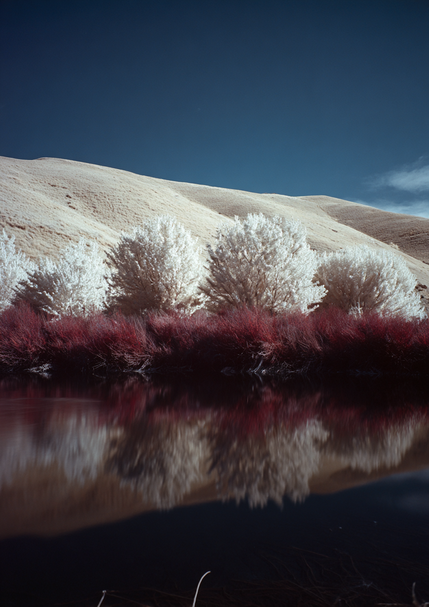 A tranquil landscape with reflective water, vibrant red shrubs, white trees, golden hills, and a deep blue sky, creating a stunning contrast.