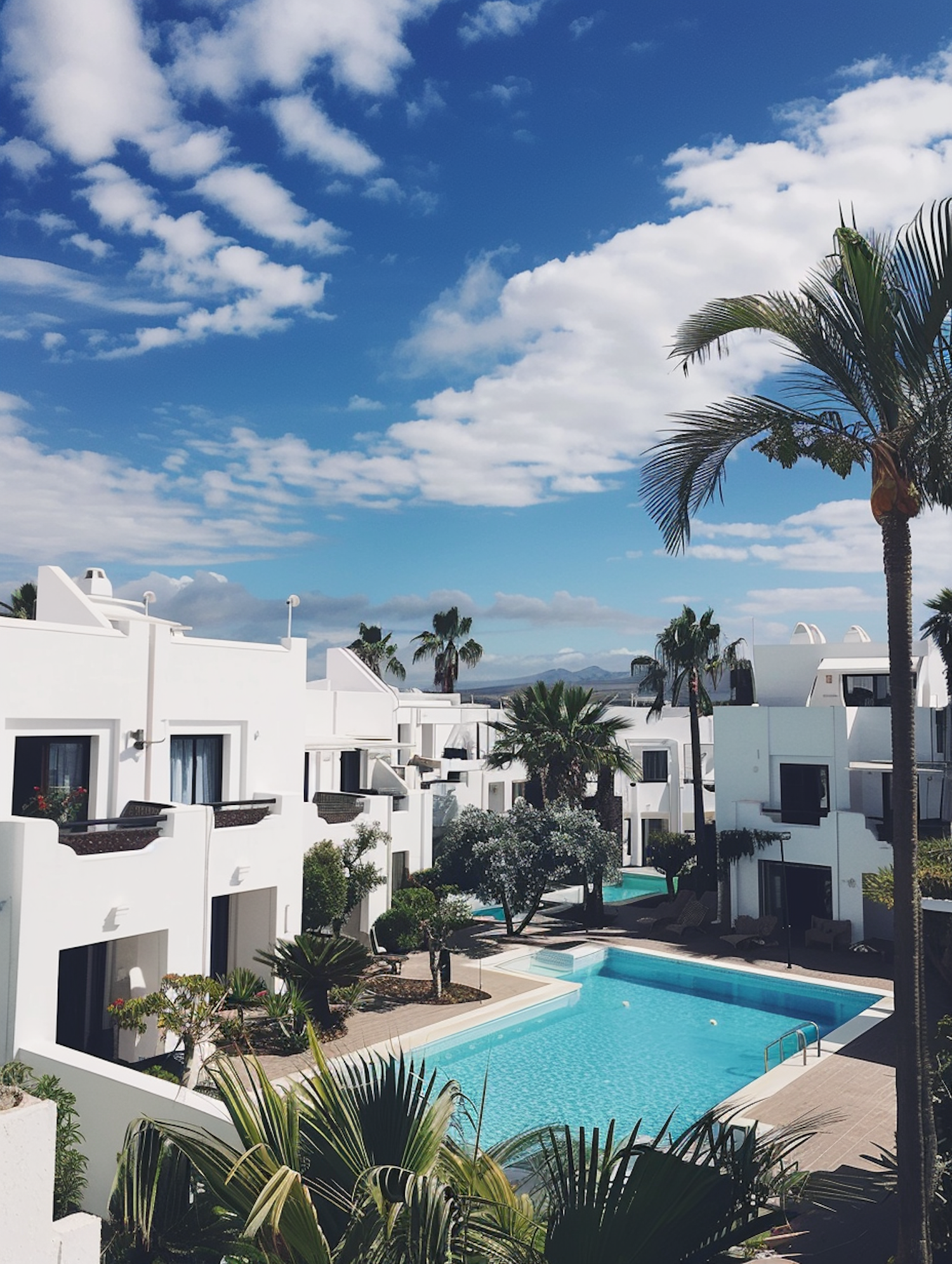 Modern white resort with a blue pool, palm trees, and a vibrant sky. Perfect for a tropical getaway.