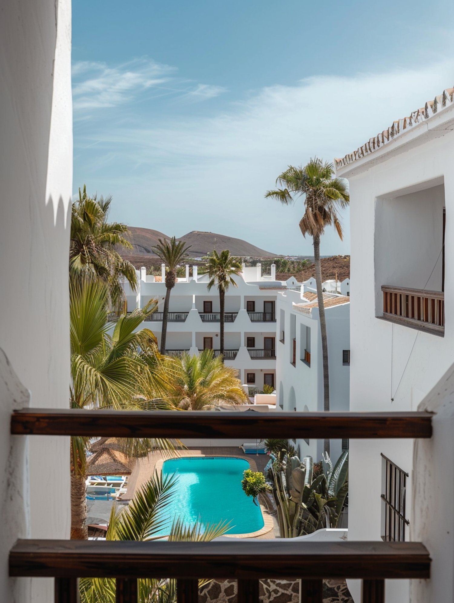 Mediterranean-style resort with white buildings, palm trees, and a turquoise pool under a clear blue sky.